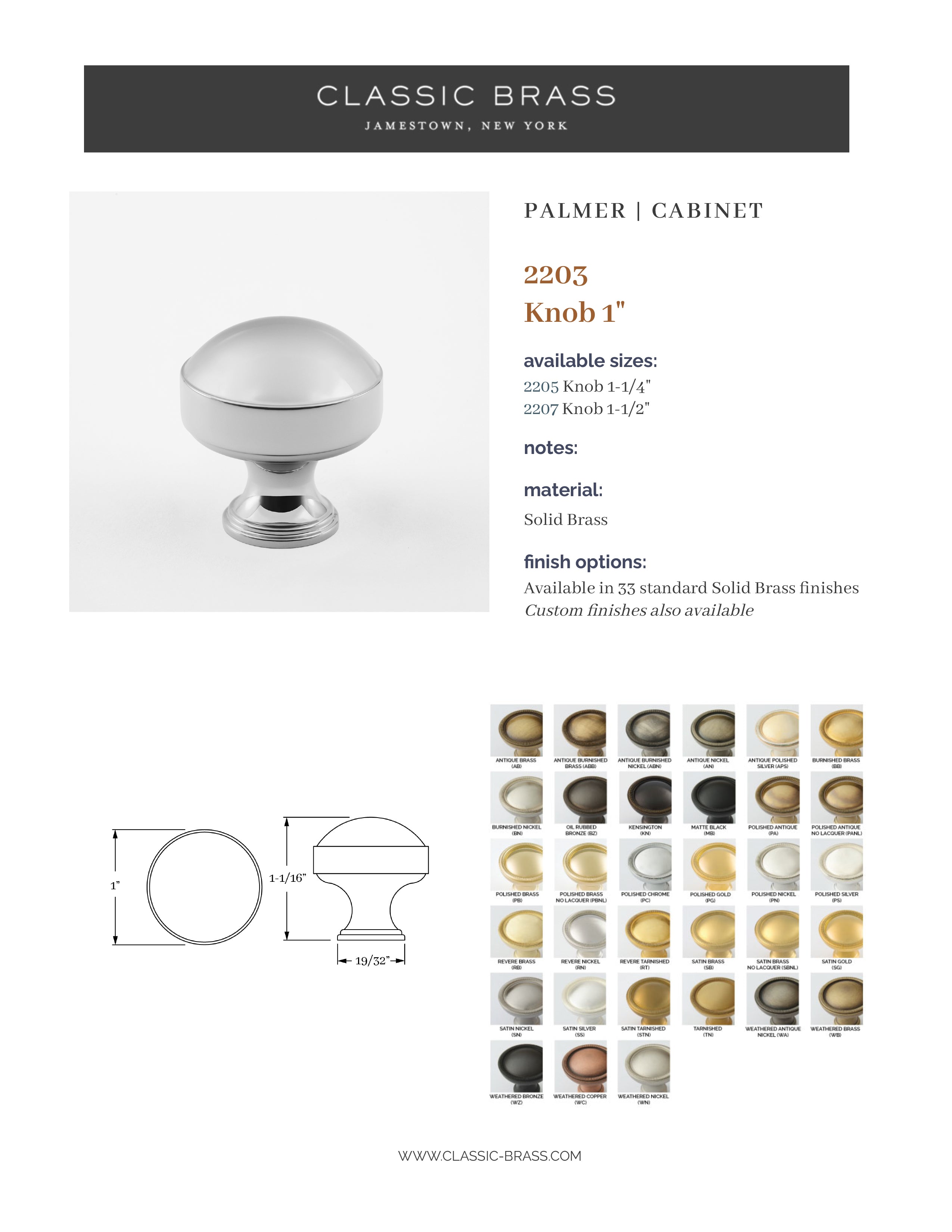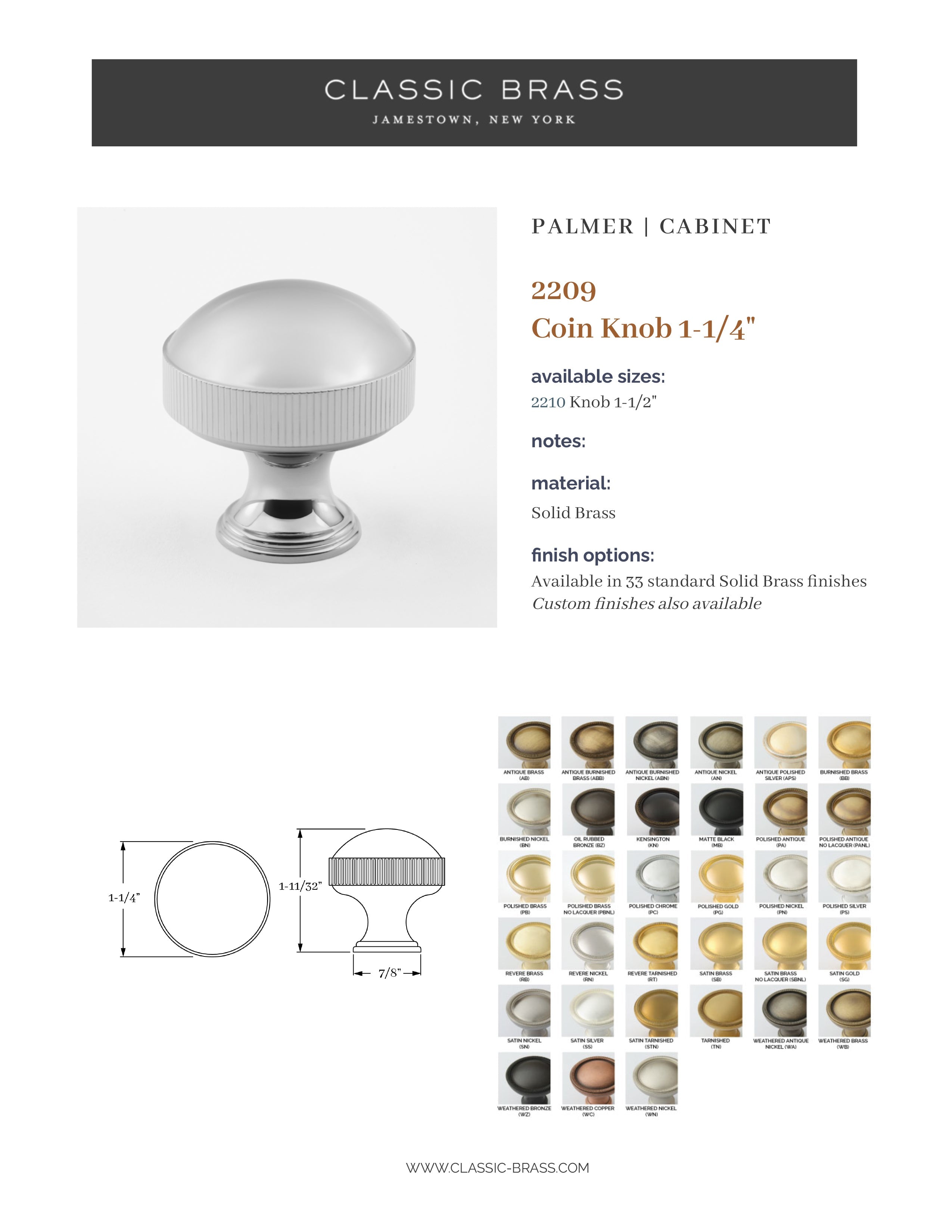 2205, Knob - 1-1/4", Classic Brass Palmer Collection