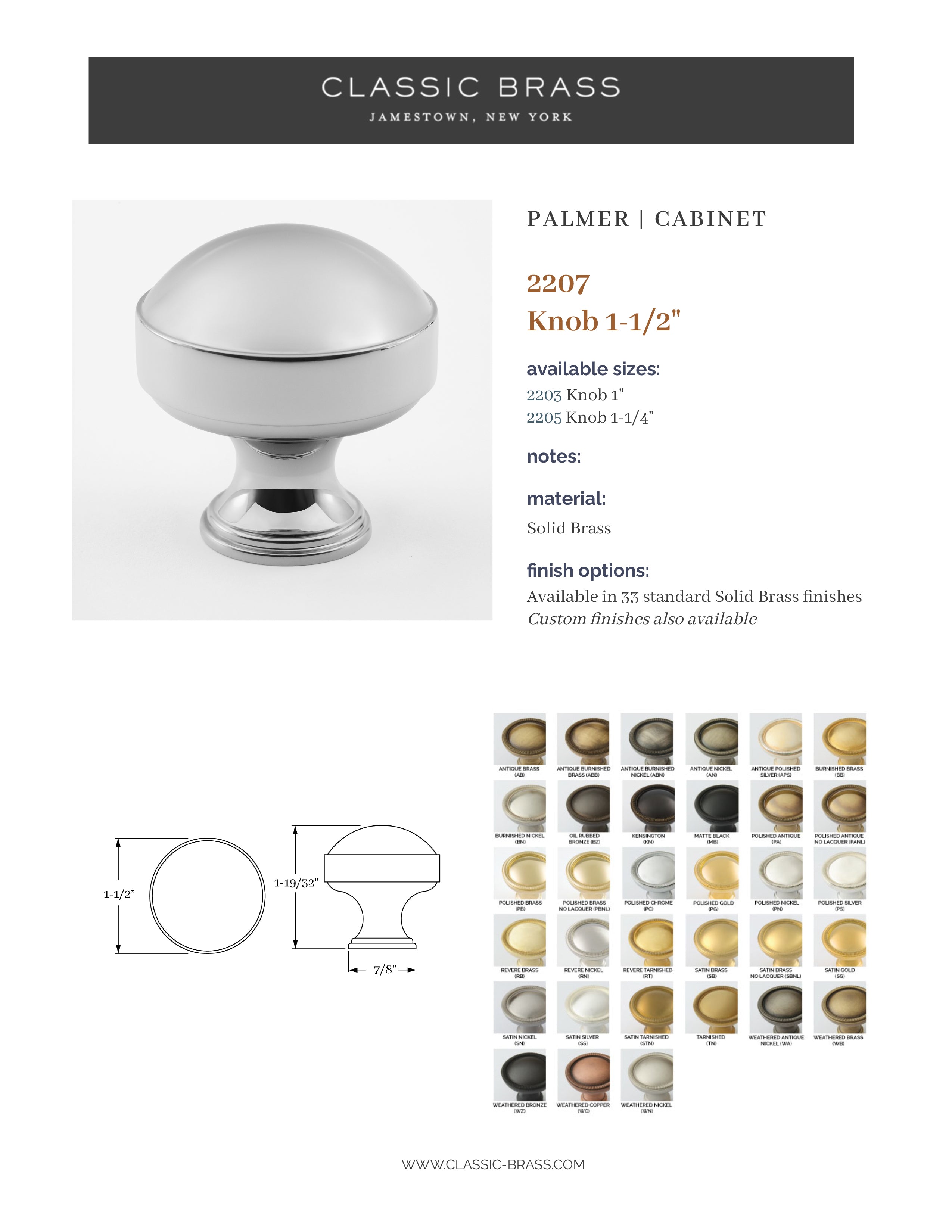 2207, Knob - 1-1/2", Classic Brass Palmer Collection