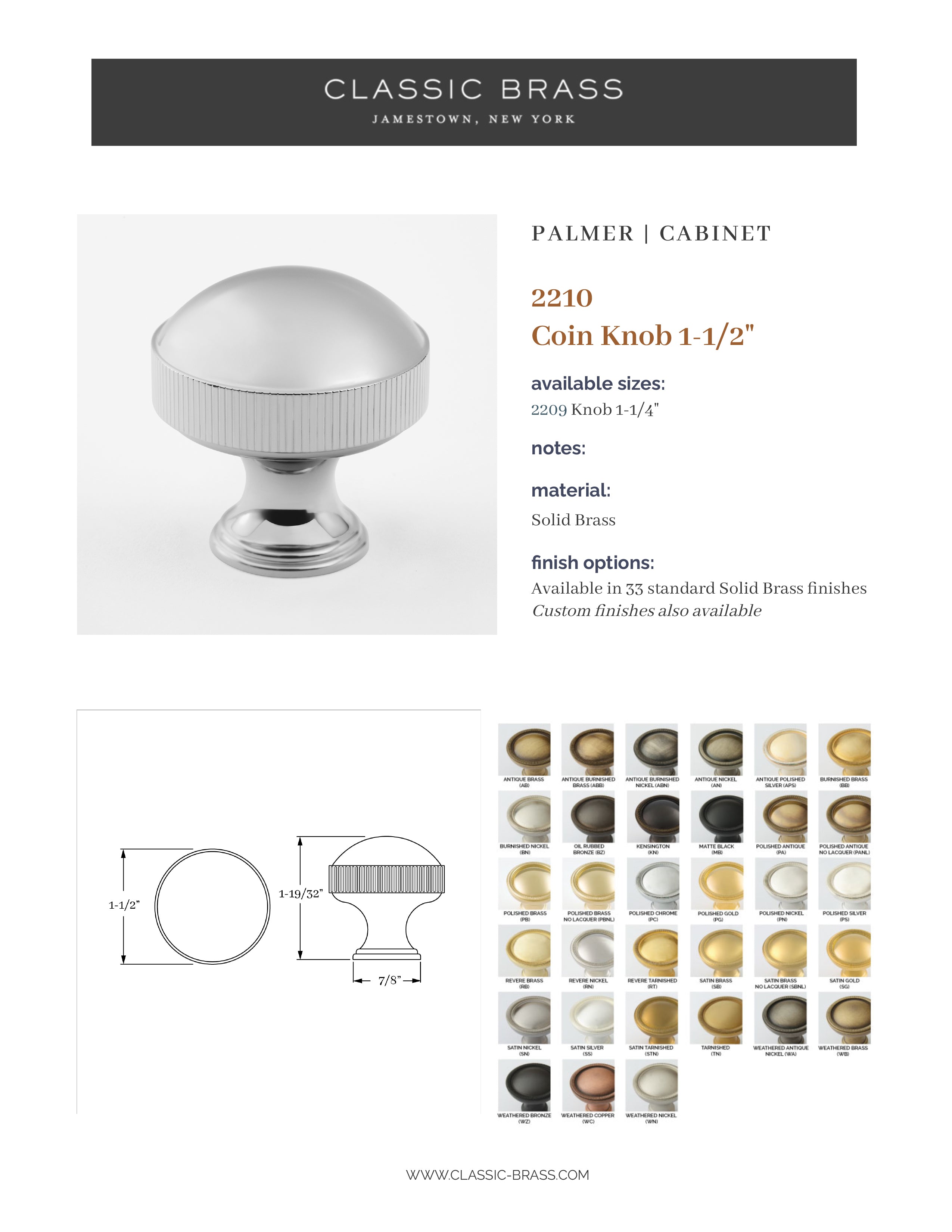 2210, Knob - Coin - 1-1/2", Classic Brass Palmer Collection