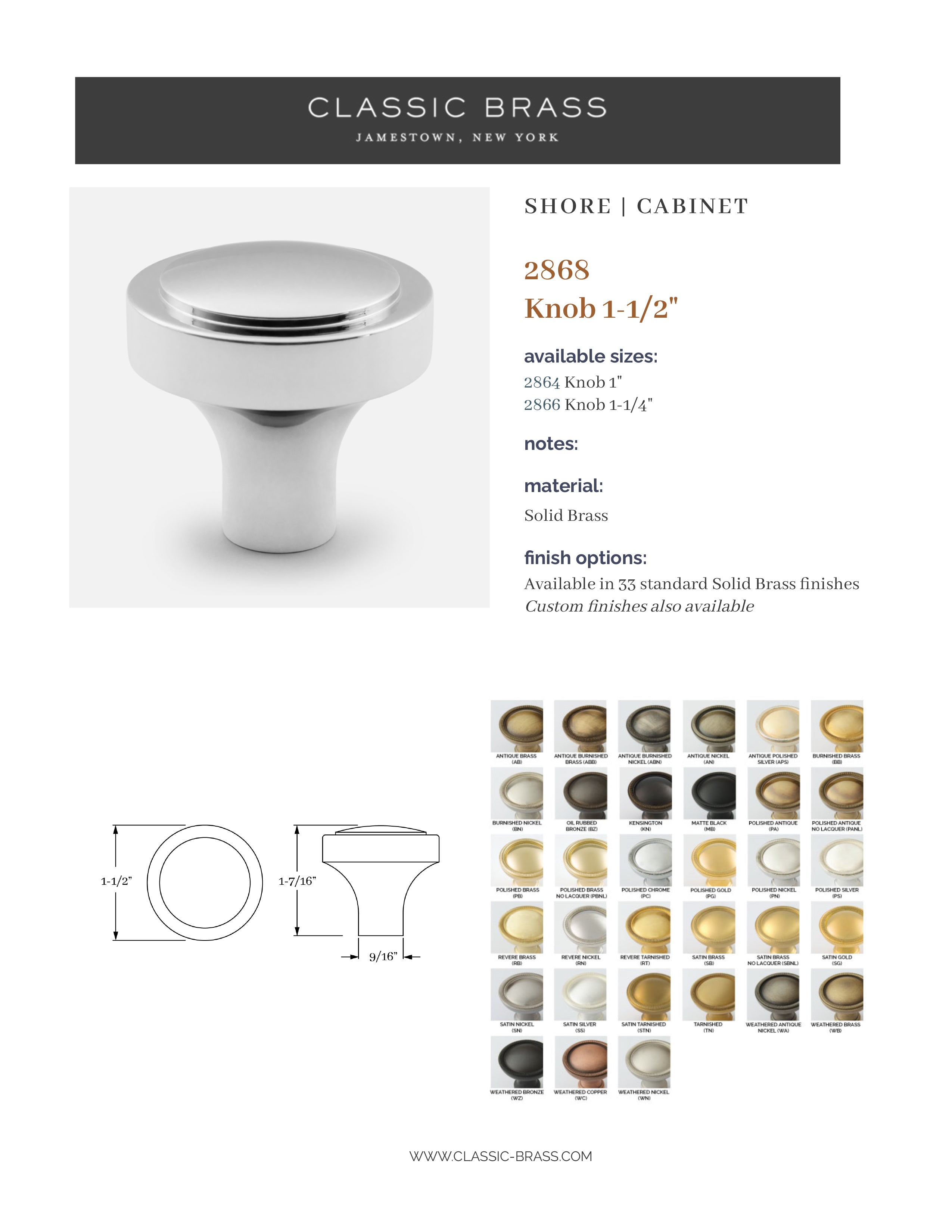 2868, Knob - 1-1/2", Classic Brass Shore Collection