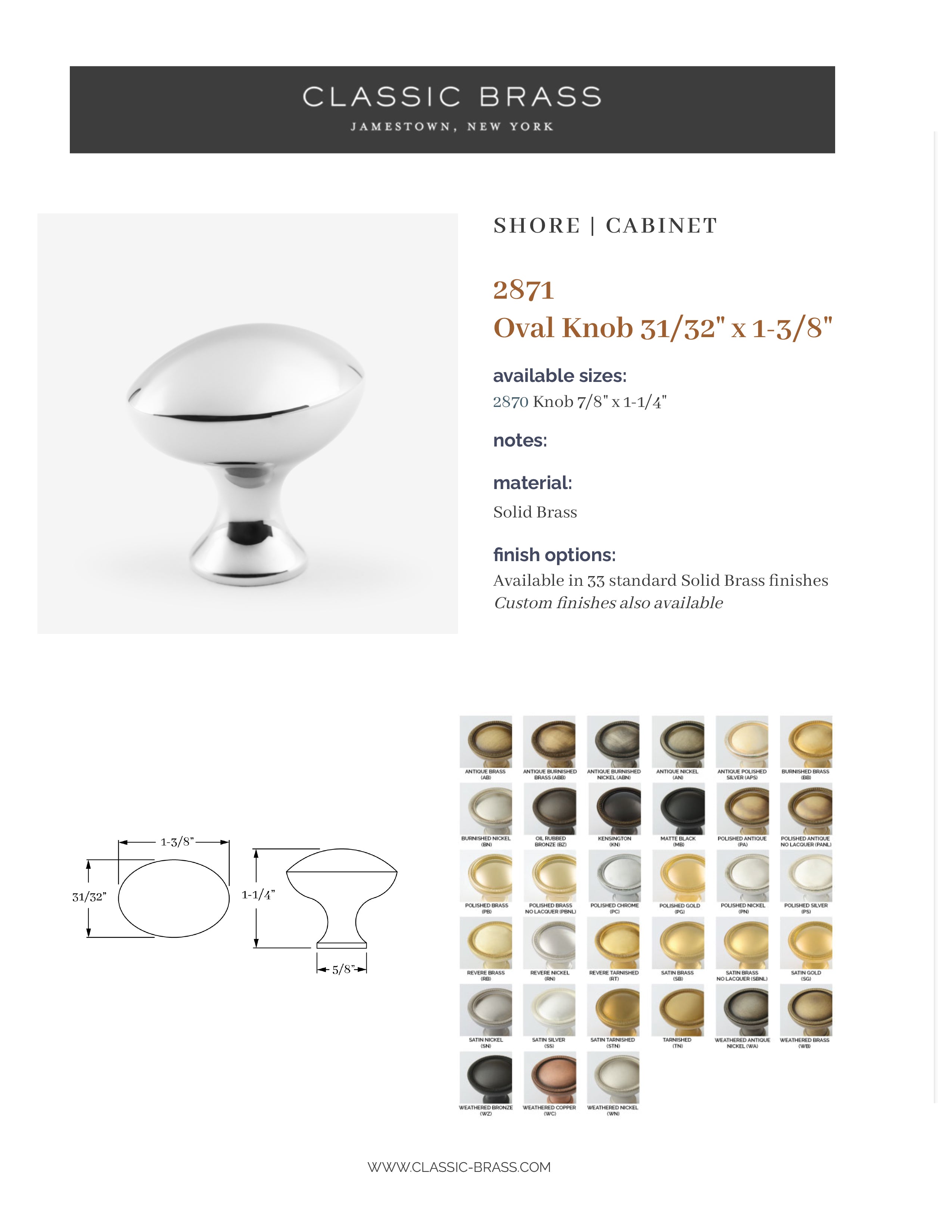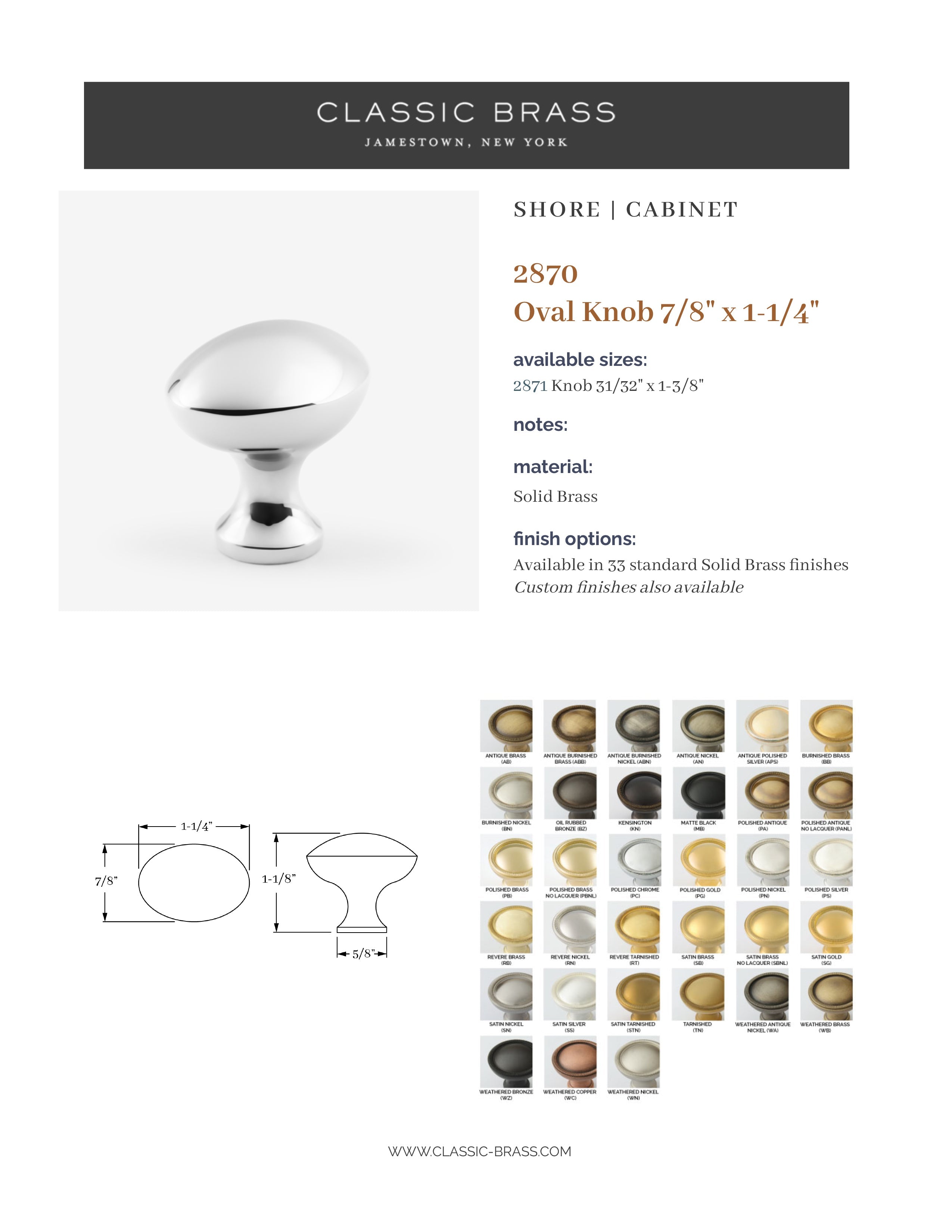 2870, Oval Knob - 1-1/4", Classic Brass Shore Collection