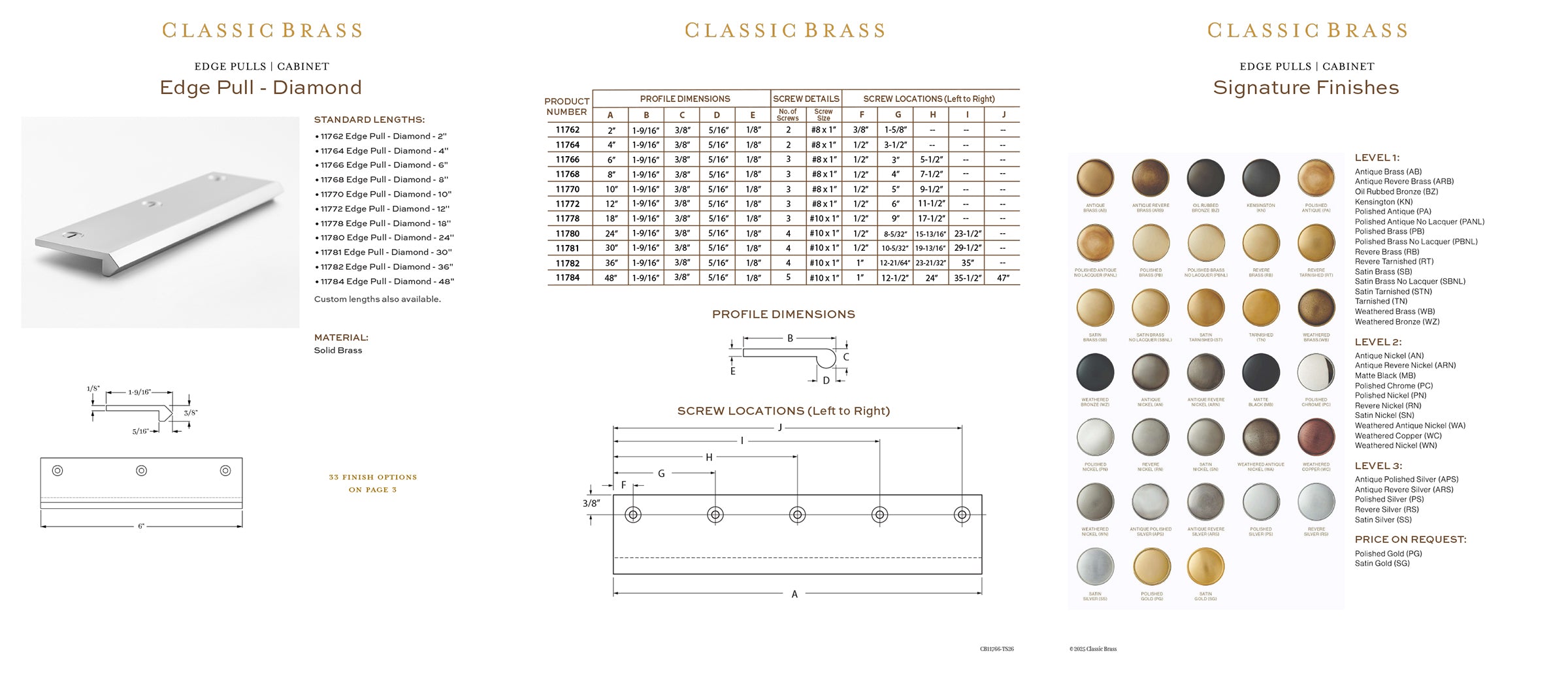 11778, Classic Brass Edge Pull - Diamond - 18", Edge Pulls Collection