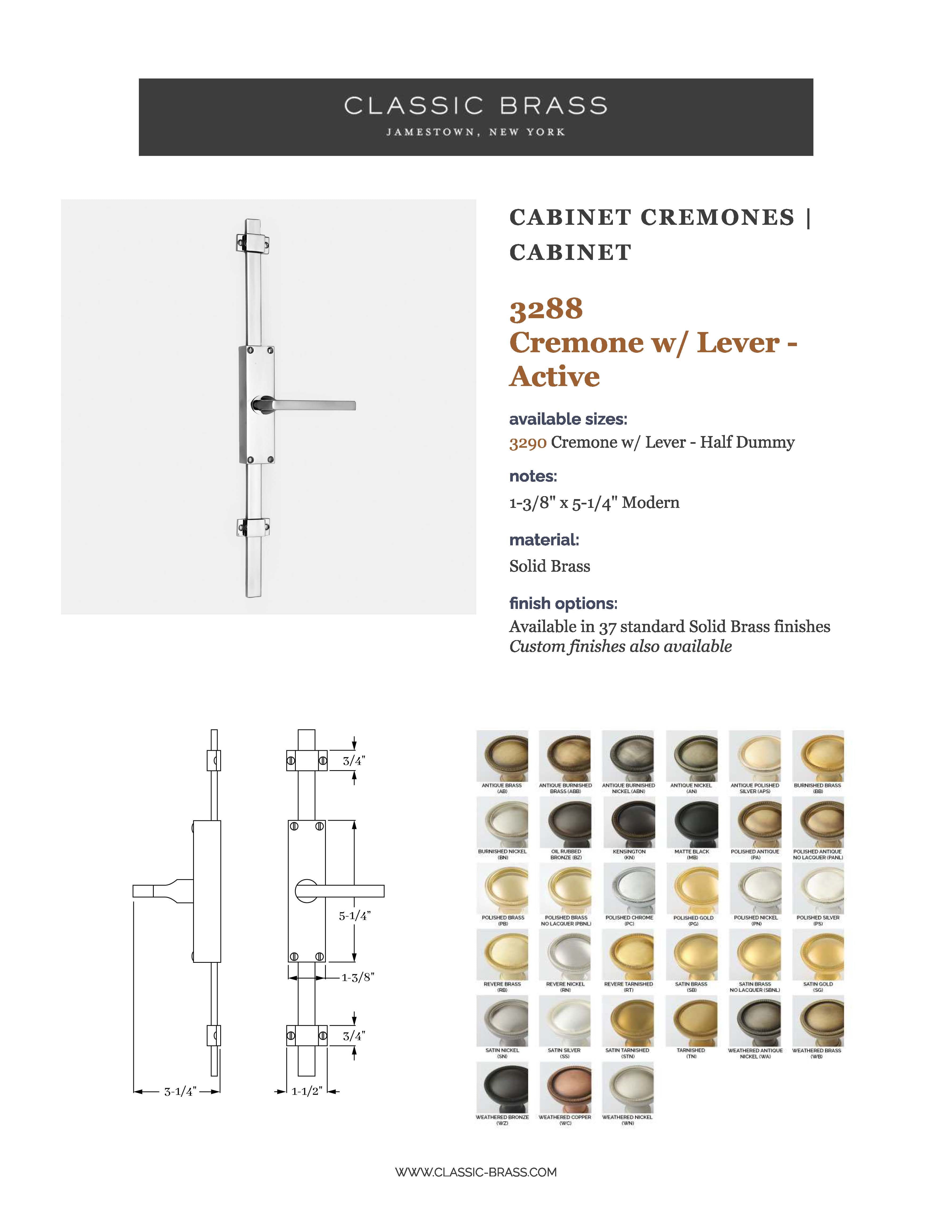 3288, Cabinet Cremone w/ Lever - Active - 1-3/8" x 5-1/4" Modern, Cabinet Cremones