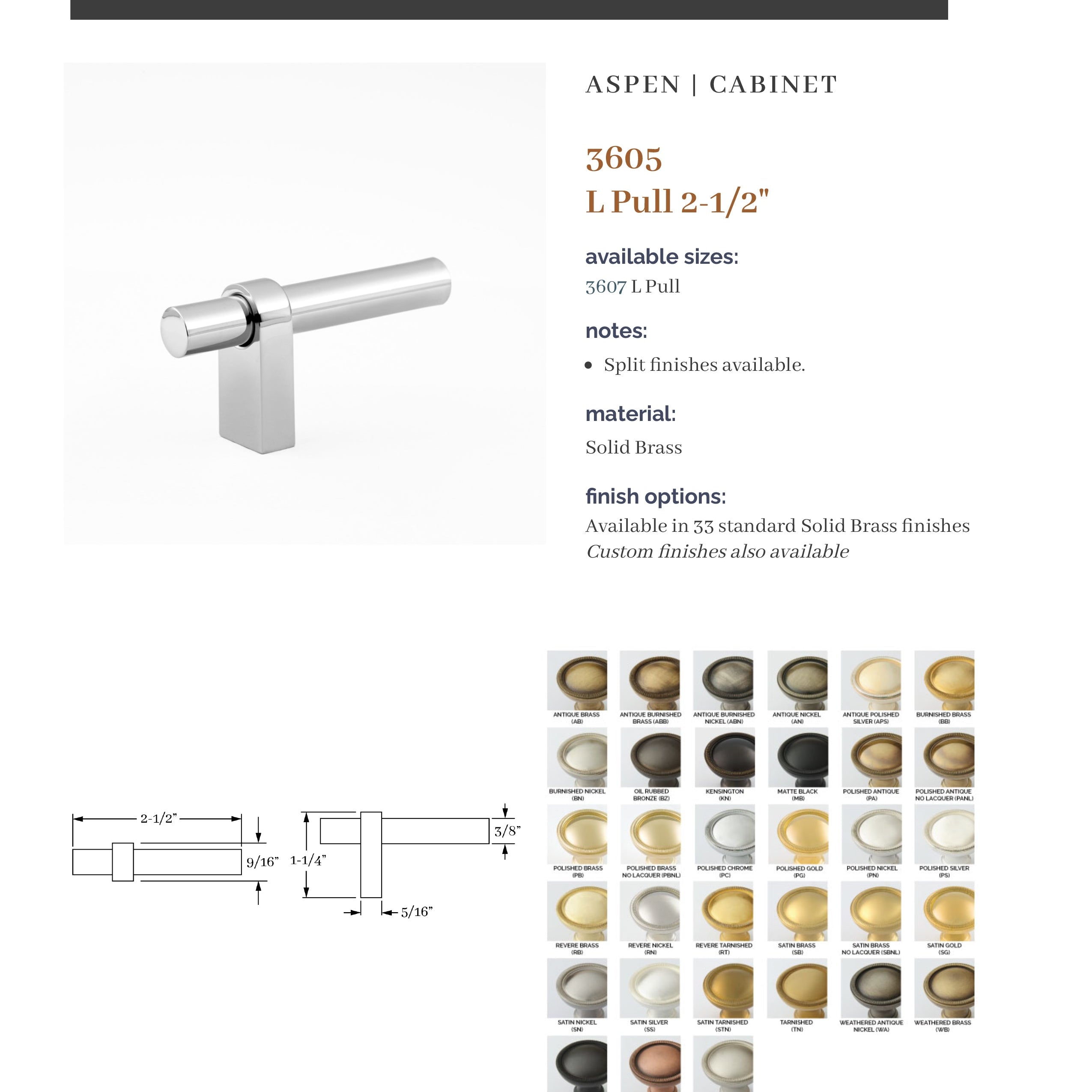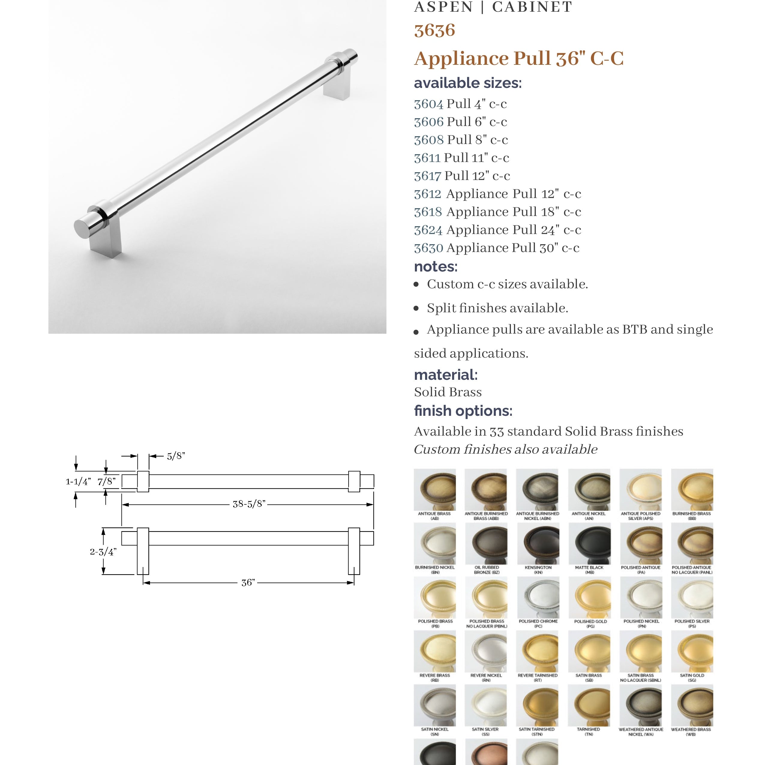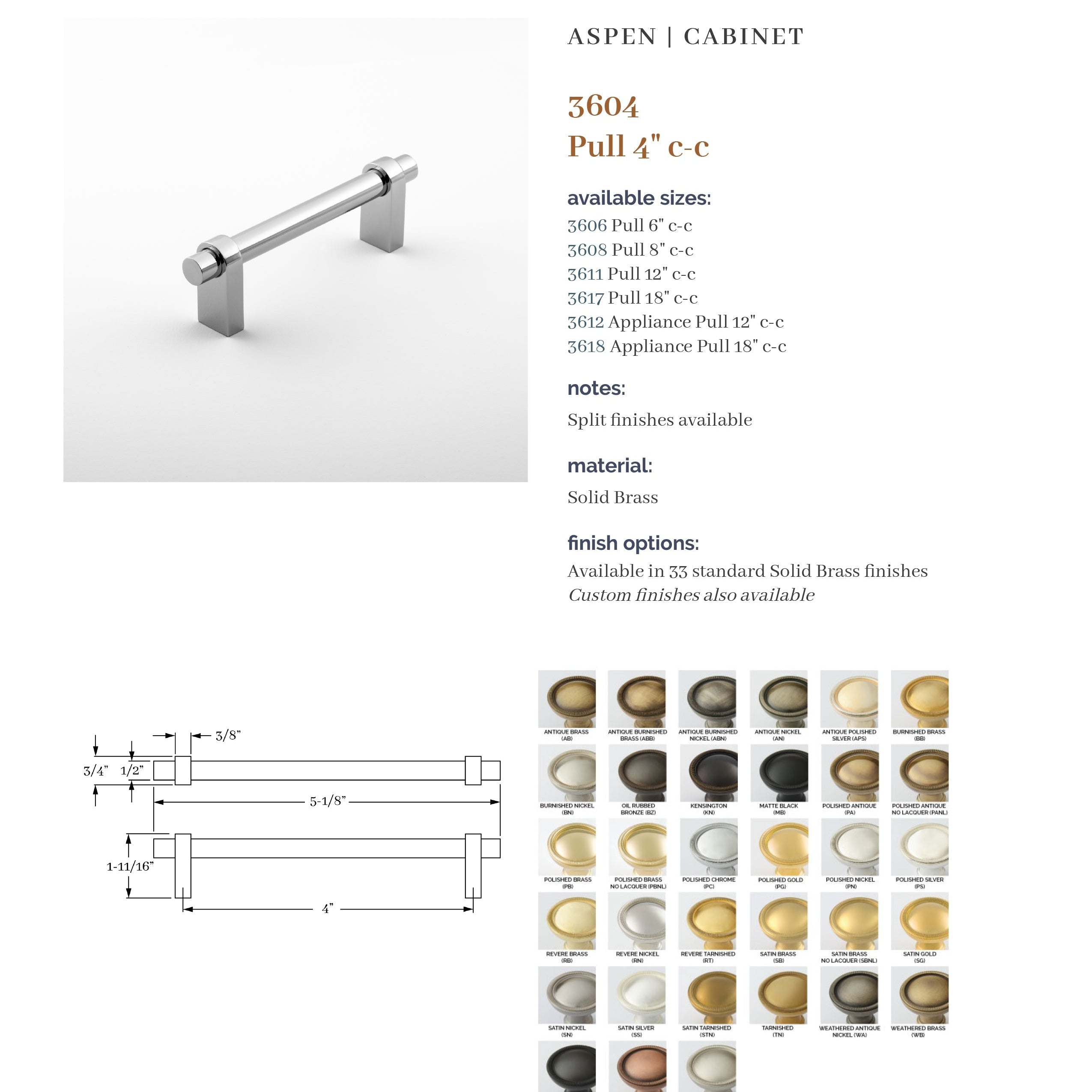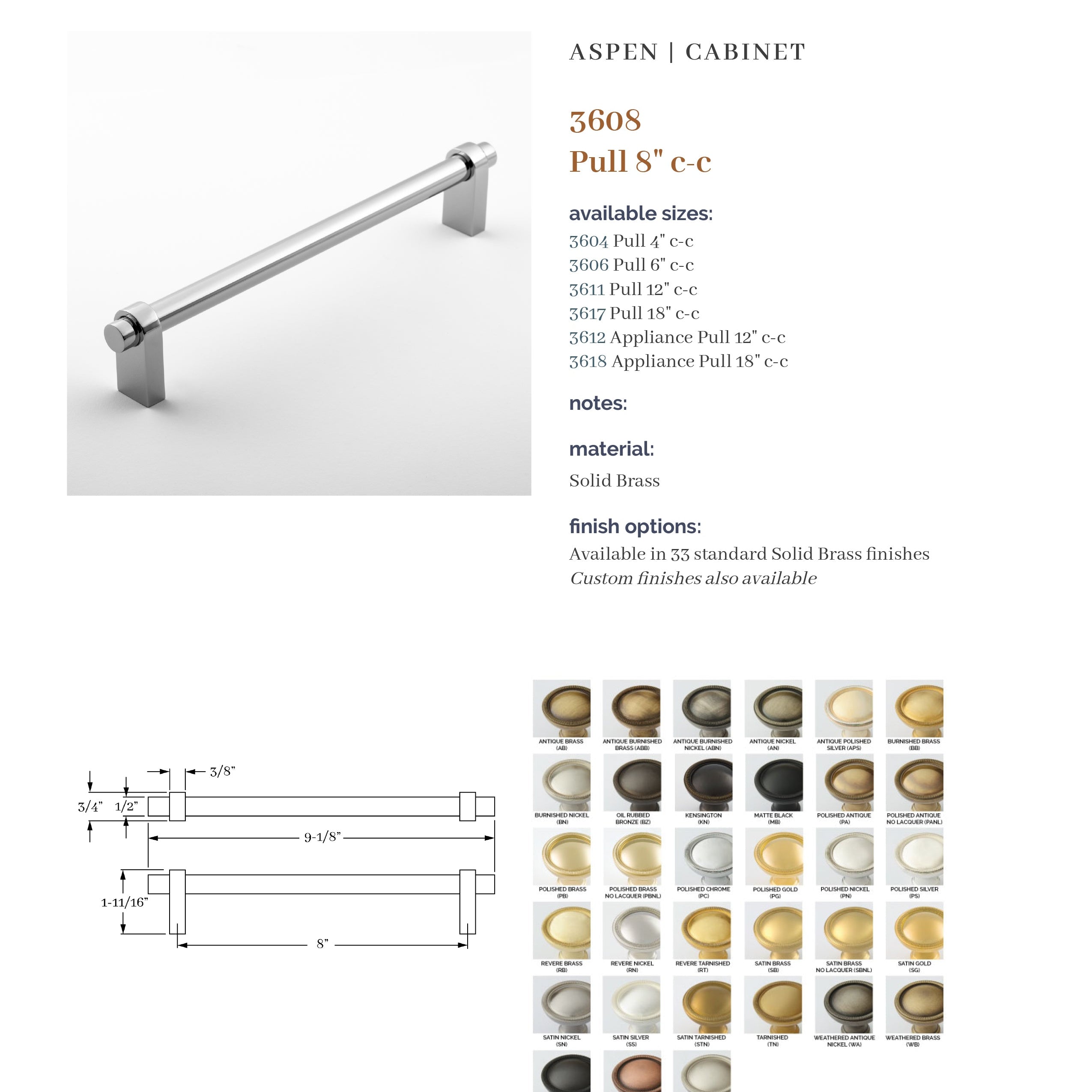 The Aspen Collection is based on a combination of products that provide a modern flavor. It is a top-selling Classic Brass collection. A unique feature is the ability to specify different finishes on the grip and arms with 37 finishes to choose from. In addition, custom center-to-center pulls are available.