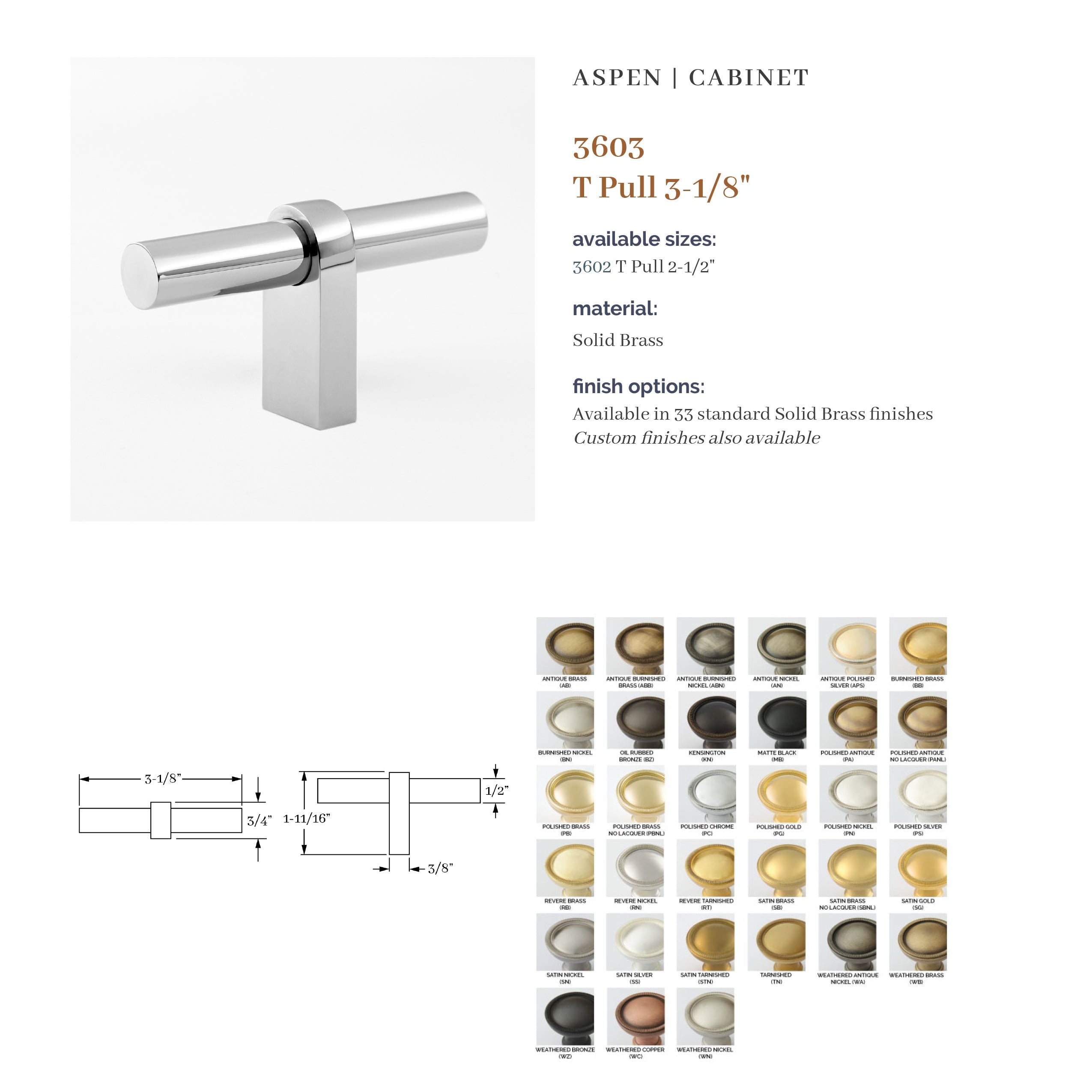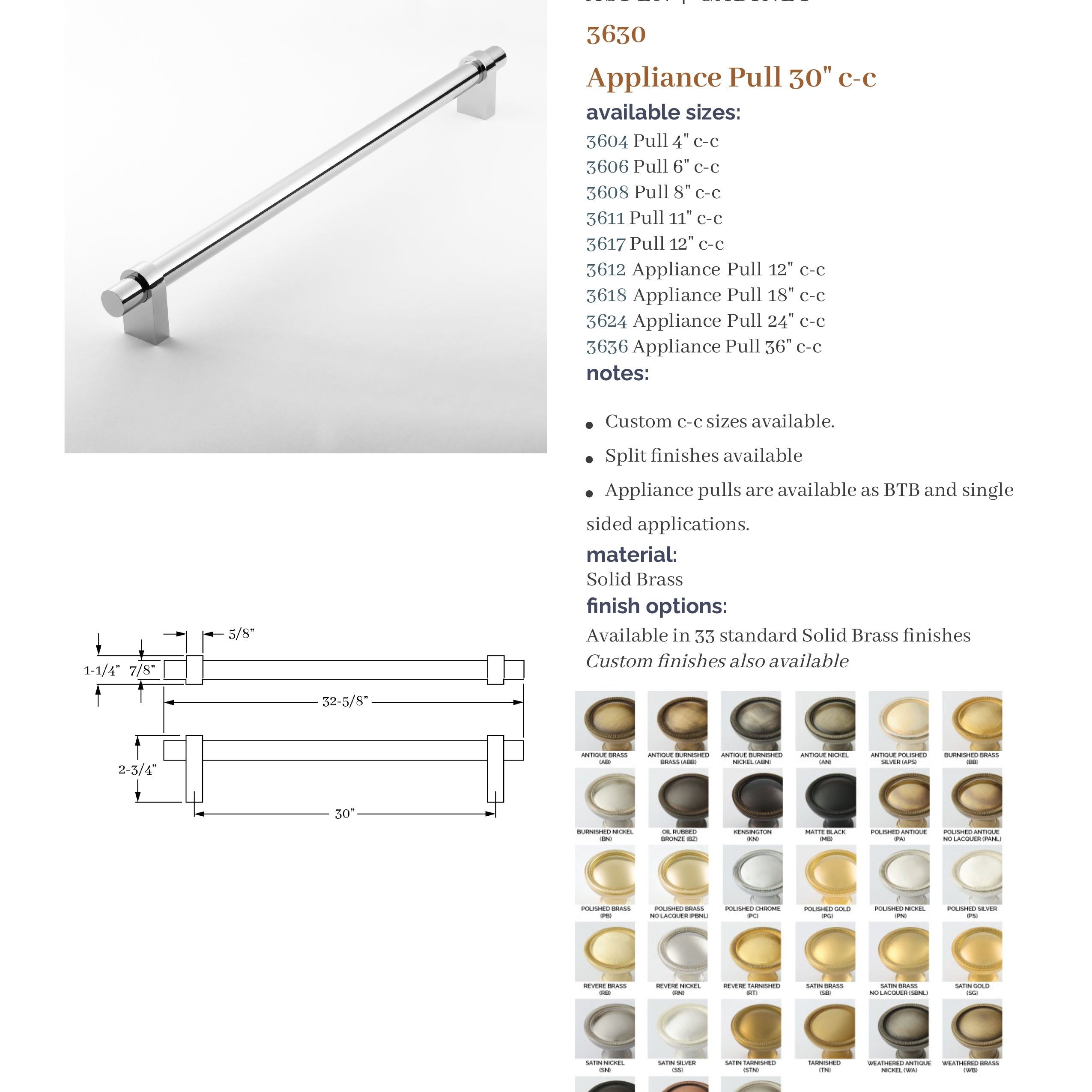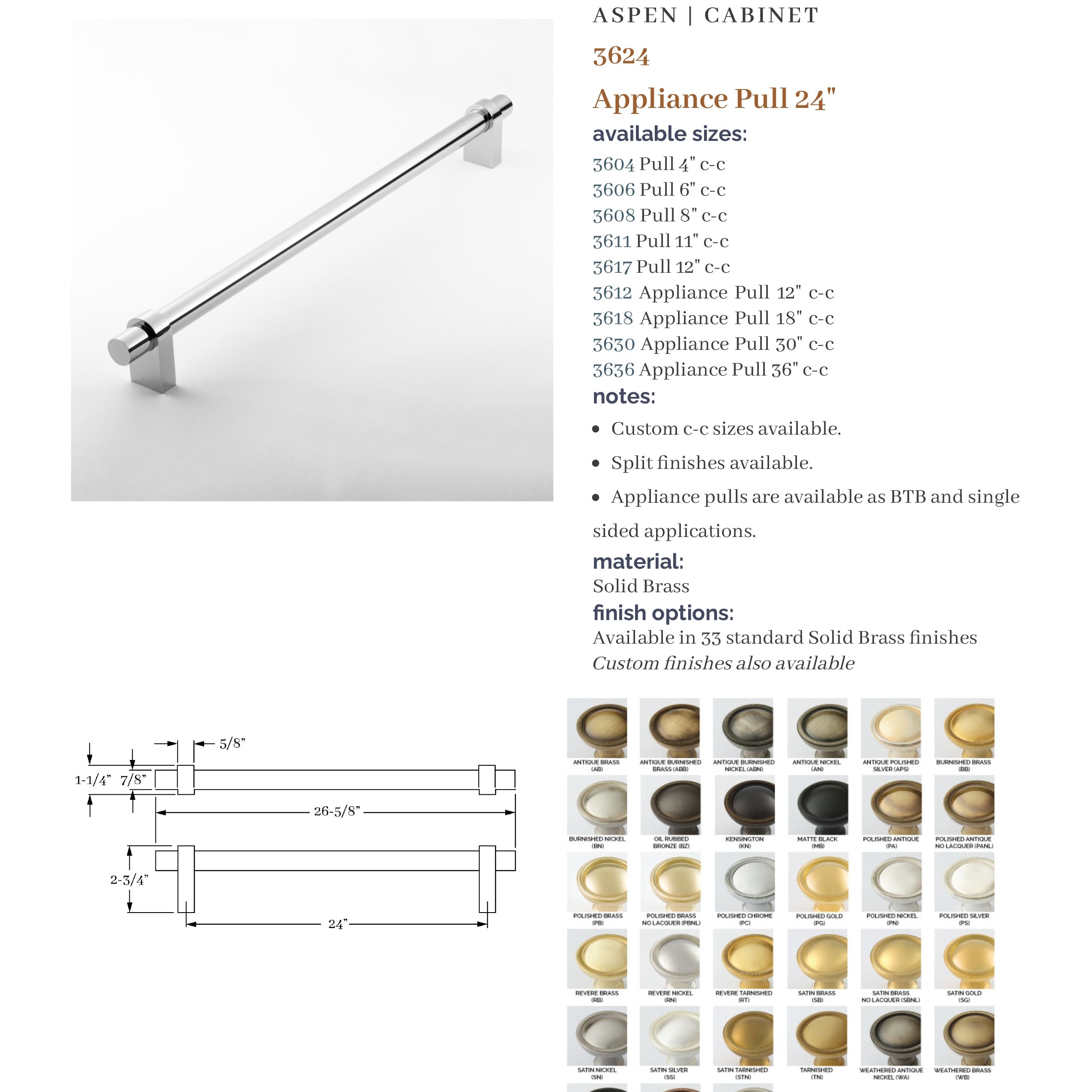 The Aspen Collection is based on a combination of products that provide a modern flavor. It is a top-selling Classic Brass collection. A unique feature is the ability to specify different finishes on the grip and arms with 37 finishes to choose from. In addition, custom center-to-center pulls are available.