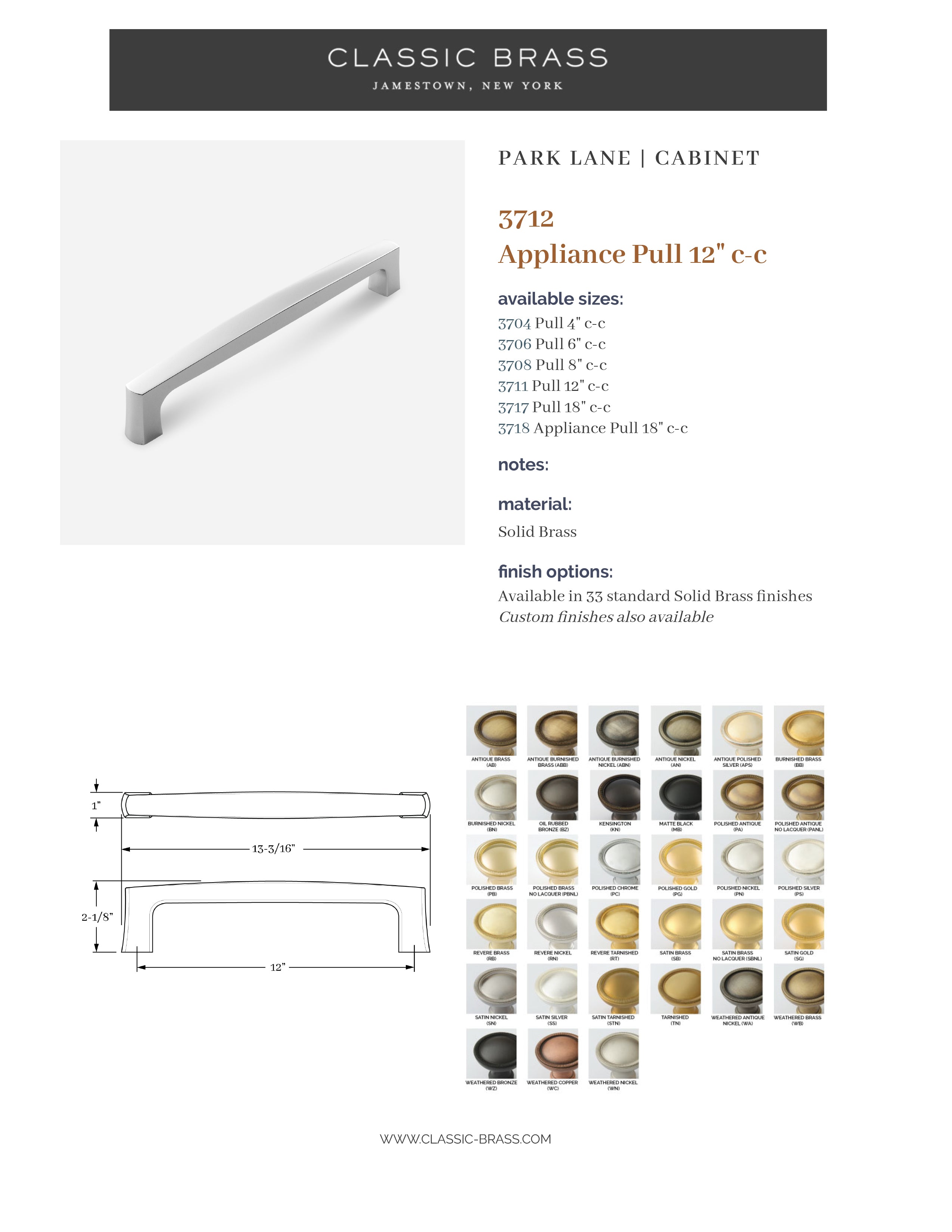 3712, Appliance Pull - 12" c-c, Classic Brass Park Lane Collection