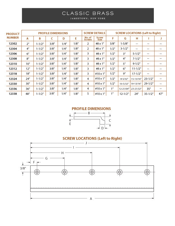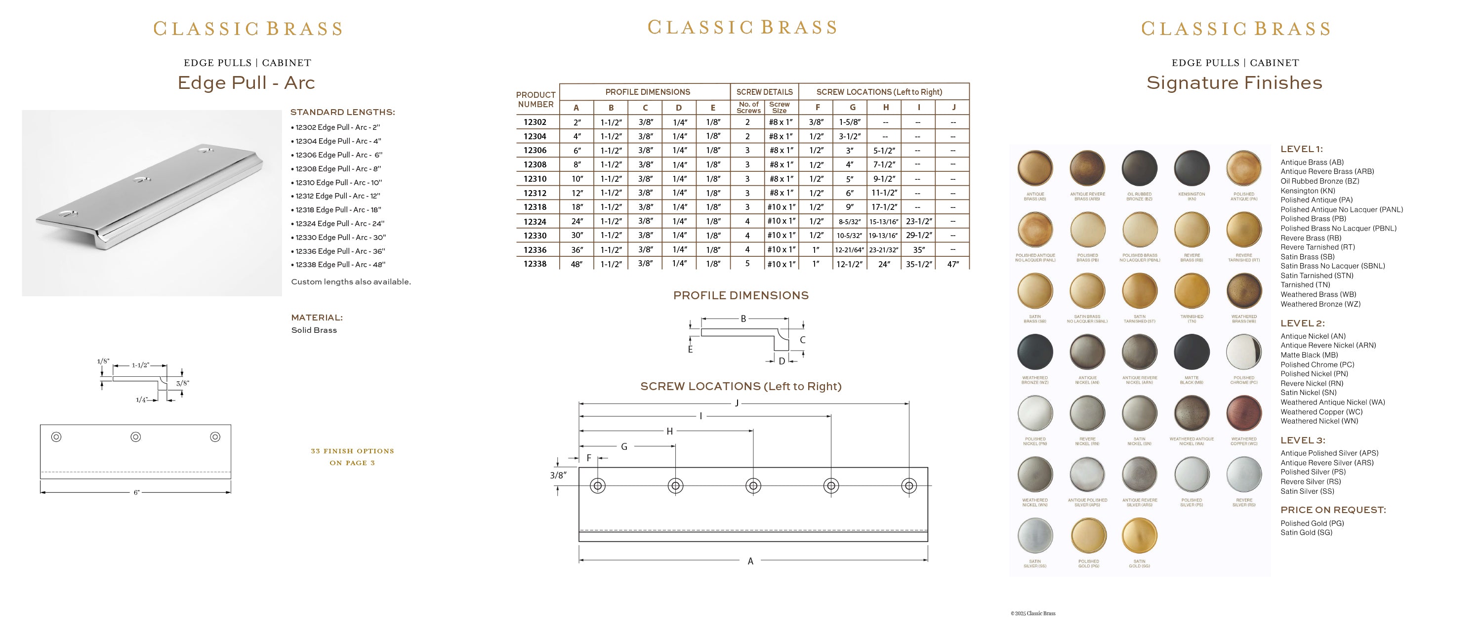 12338, Classic Brass Edge Pull - ARC - 48" x 1-1/2" oa, Edge Pulls Collection