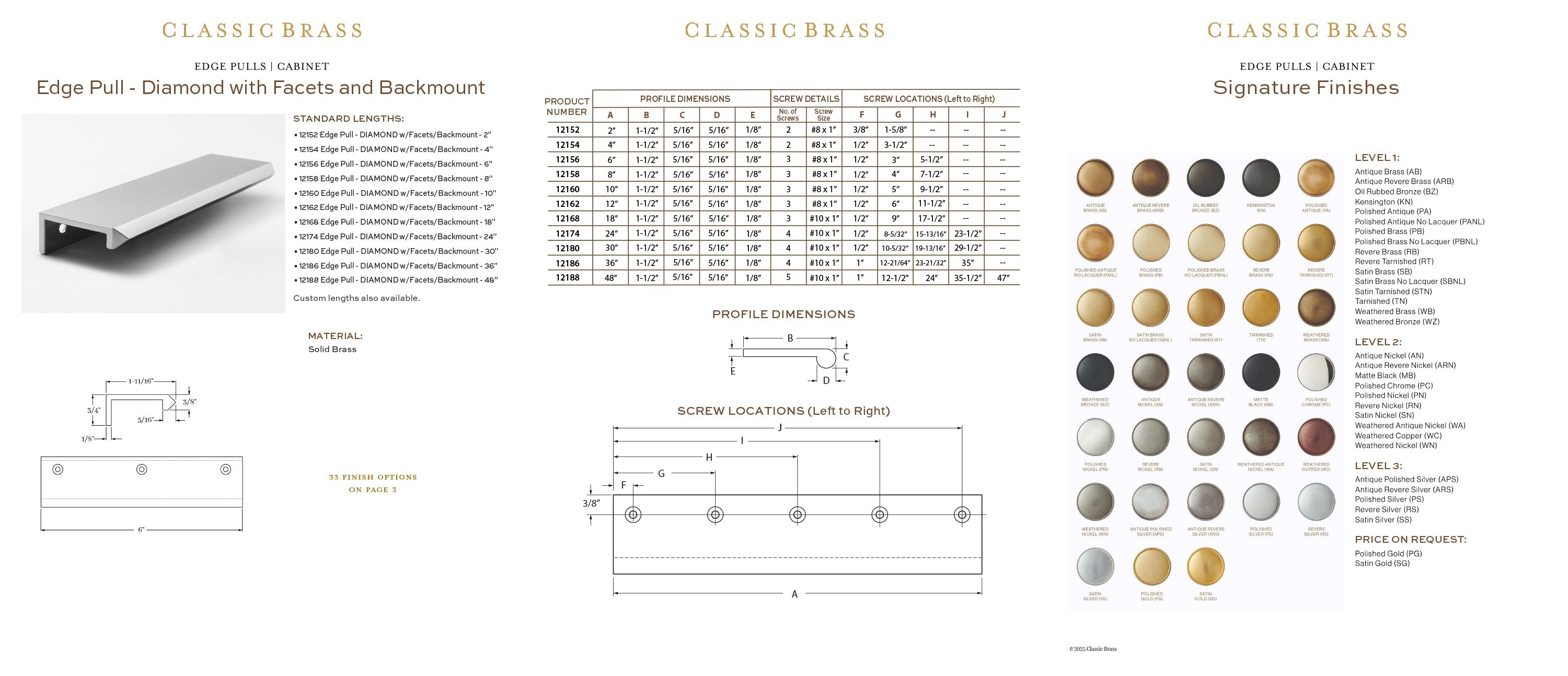 12188, Classic Brass Edge Pull - Diamond w/Facets - w/Backmount - 48", Edge Pulls Collection