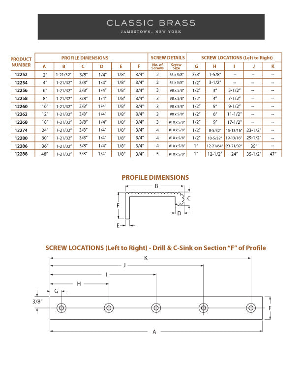 12288, Classic Brass Edge Pull - Reed w/ Backmount - 48" x 1-5/8" oa, Edge Pulls Collection