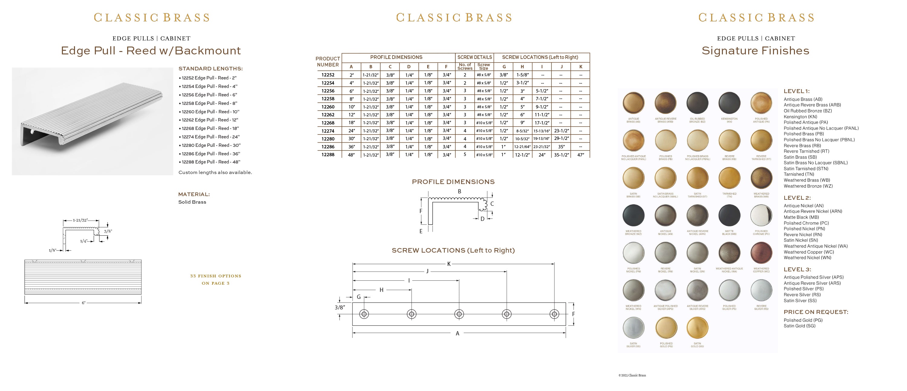 12286, Classic Brass Edge Pull - Reed w/ Backmount - 36" x 1-5/8" oa, Edge Pulls Collection