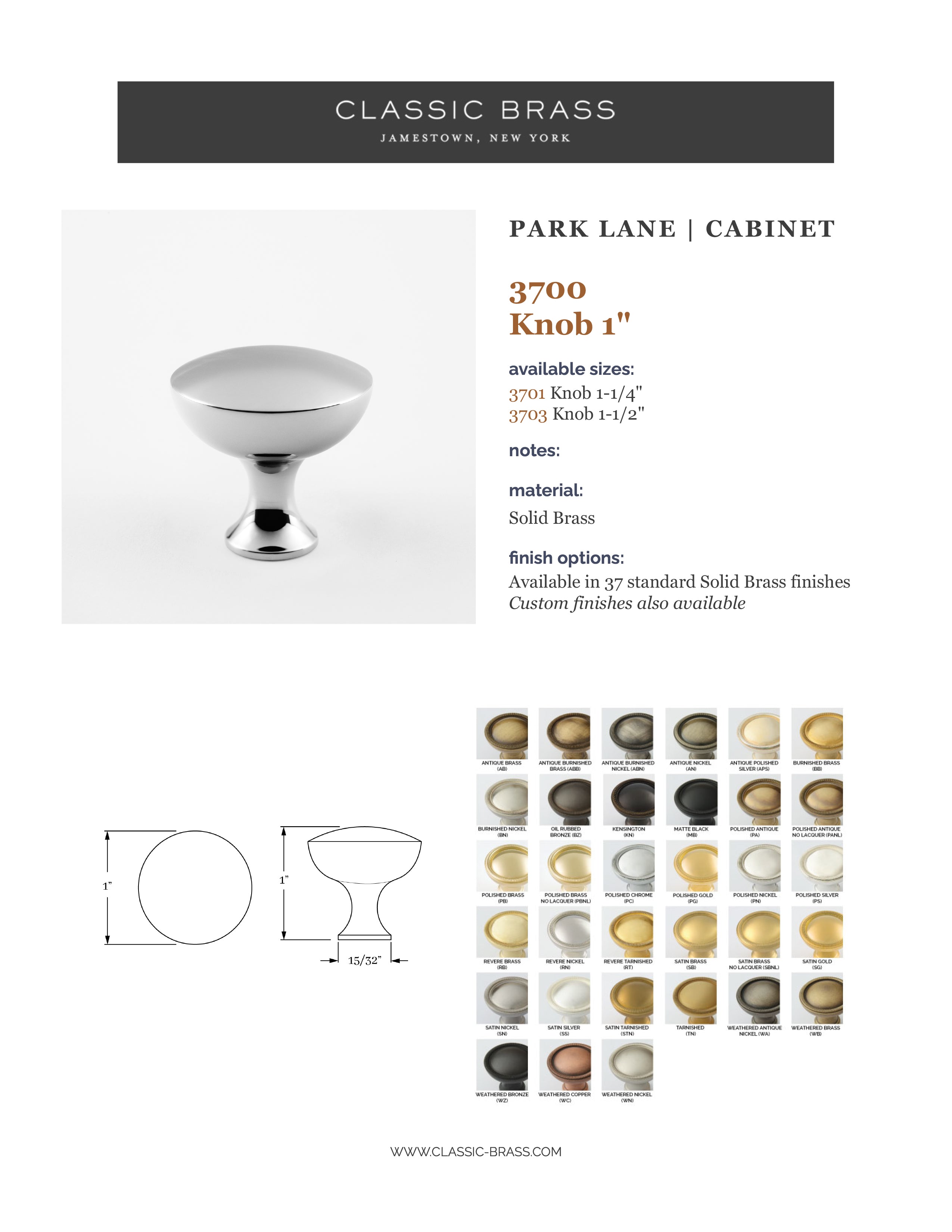 3701, Knob - 1-1/4", Classic Brass Park Lane Collection