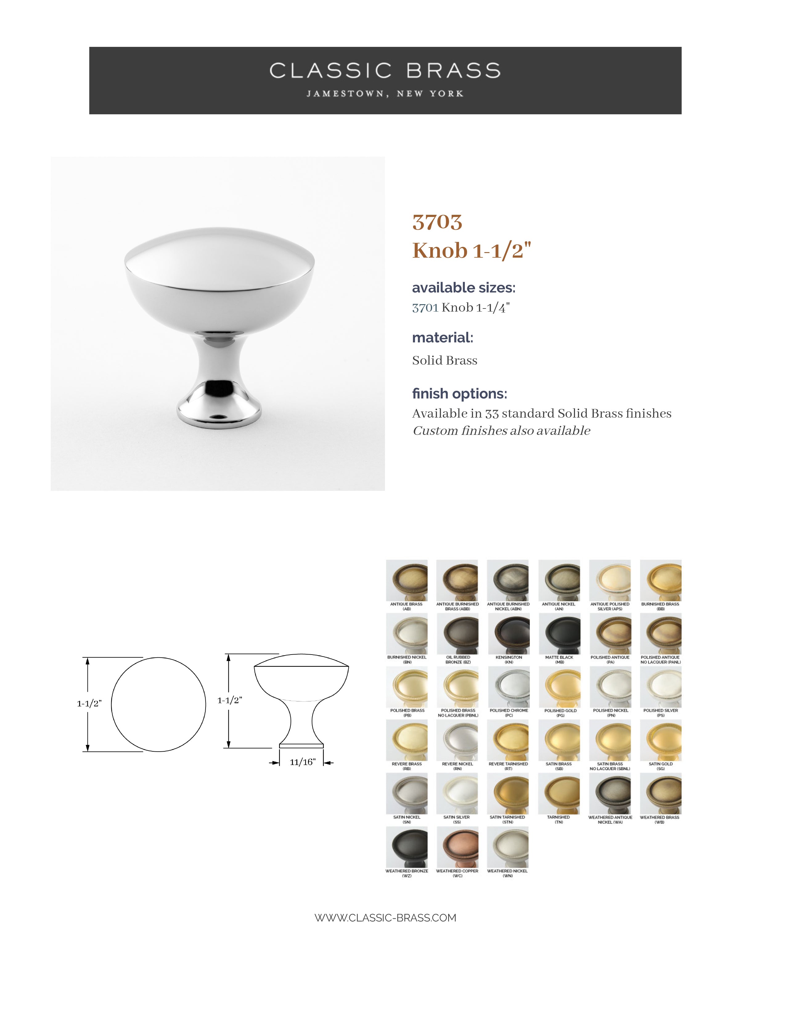 3703, Knob - 1-1/2", Classic Brass Park Lane Collection