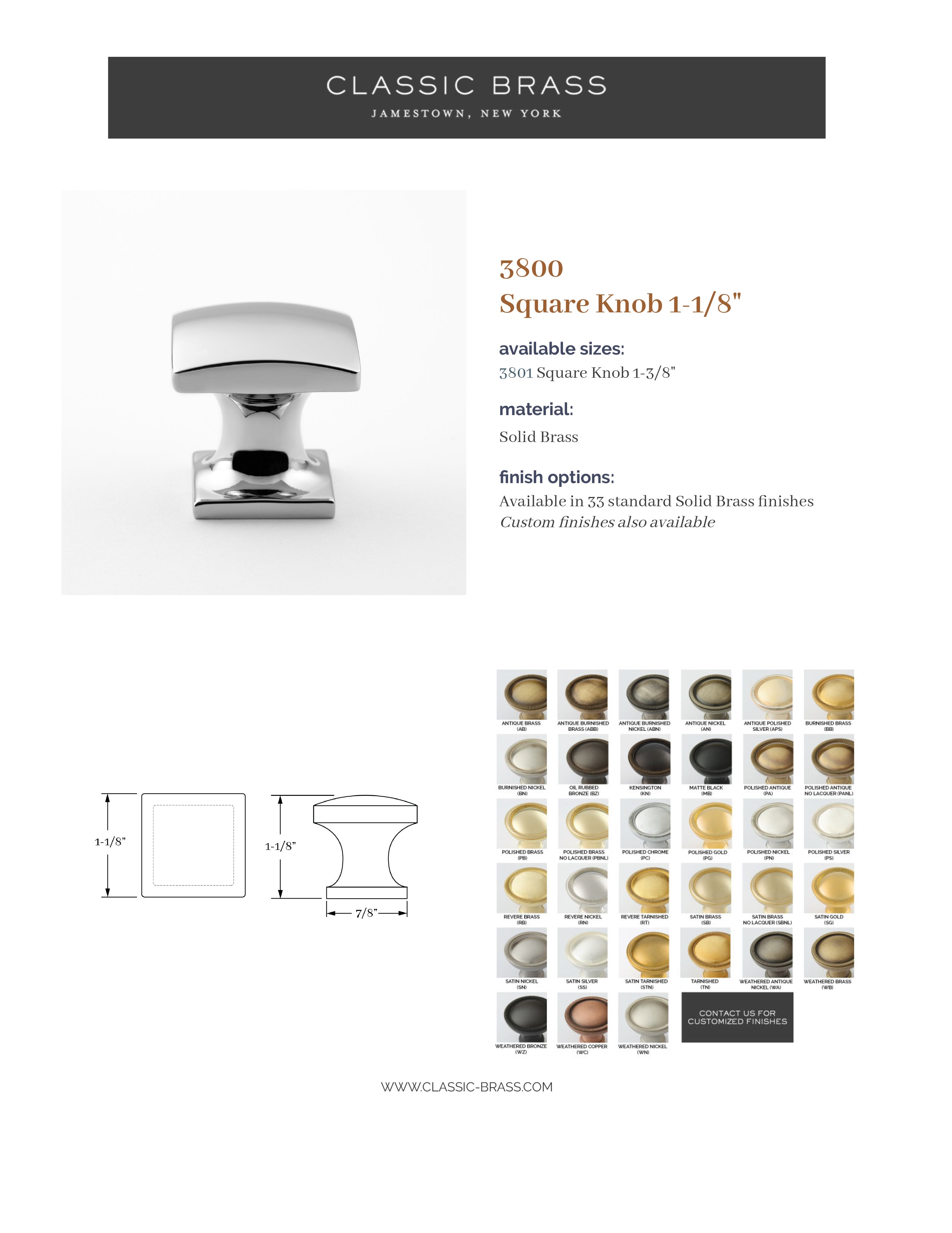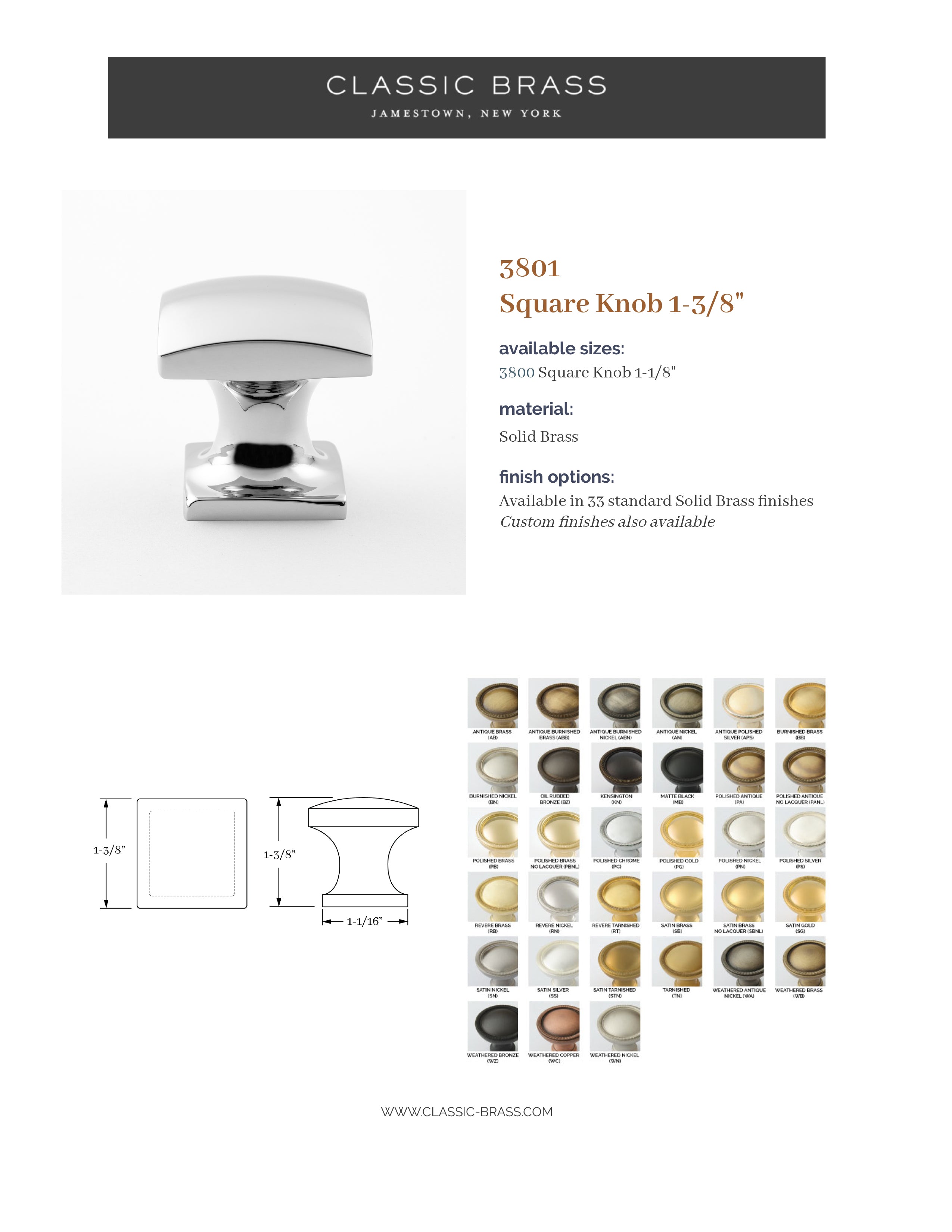 3800, Square Knob - 1-1/8", Classic Brass Founders Collection