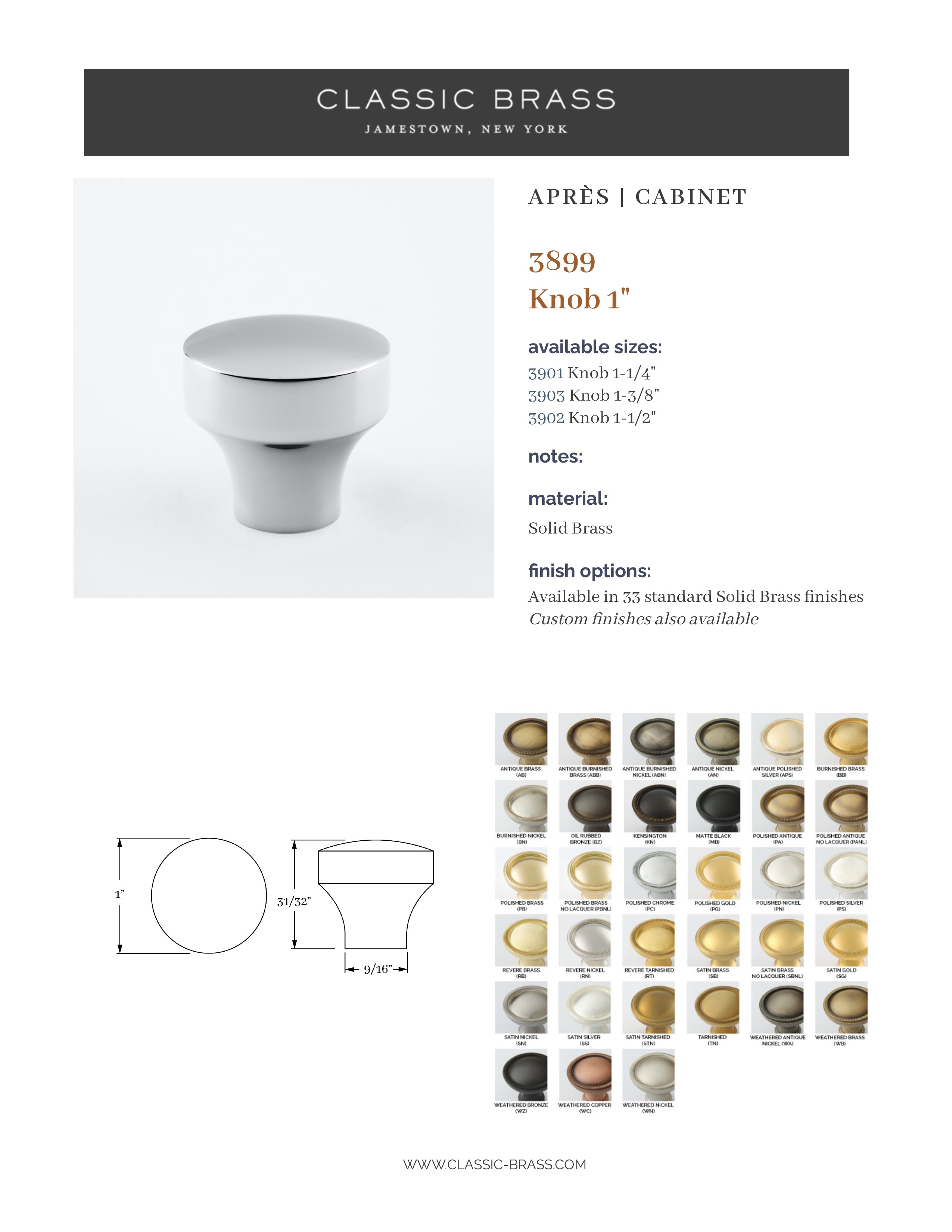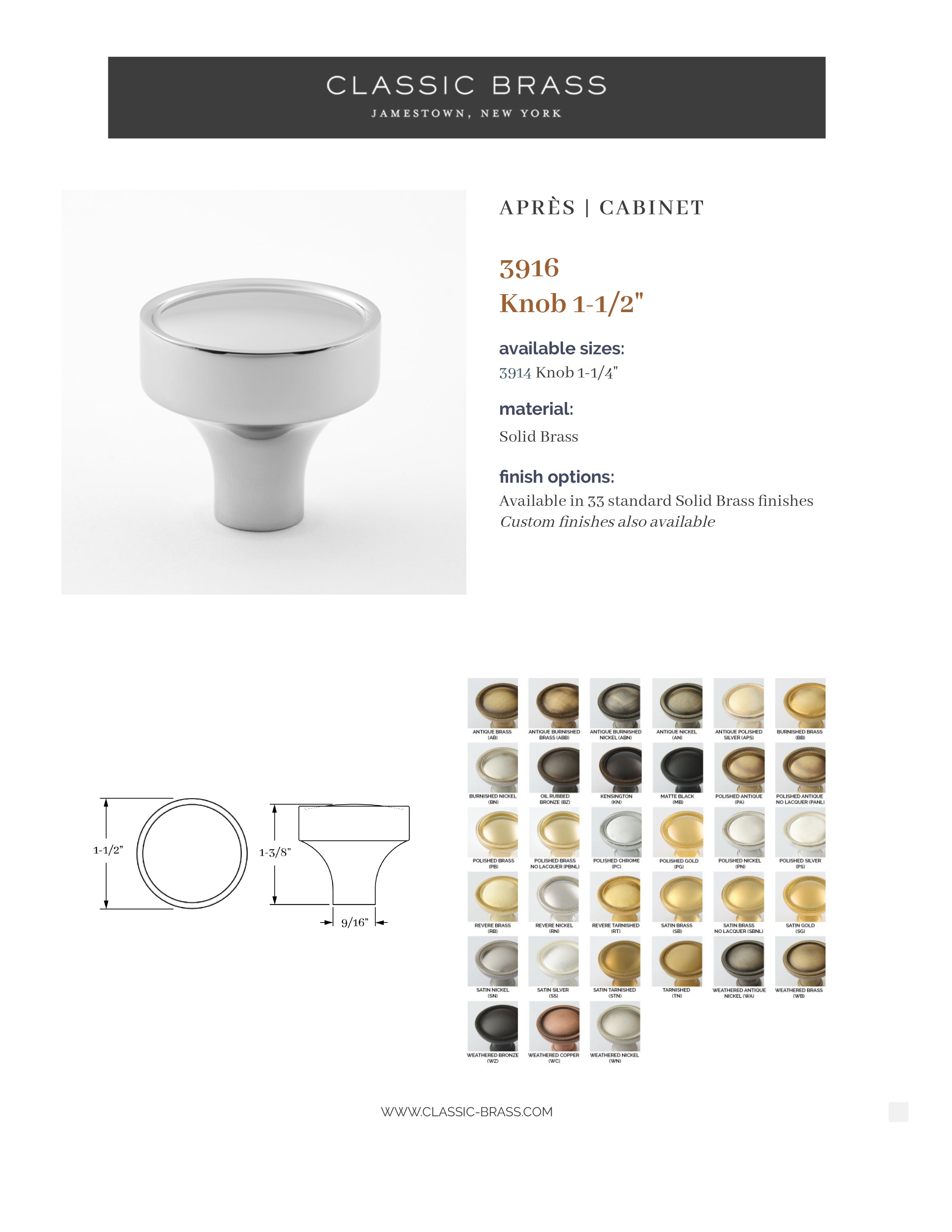 3916, Knob - 1-1/2", Classic Brass Apres Collection