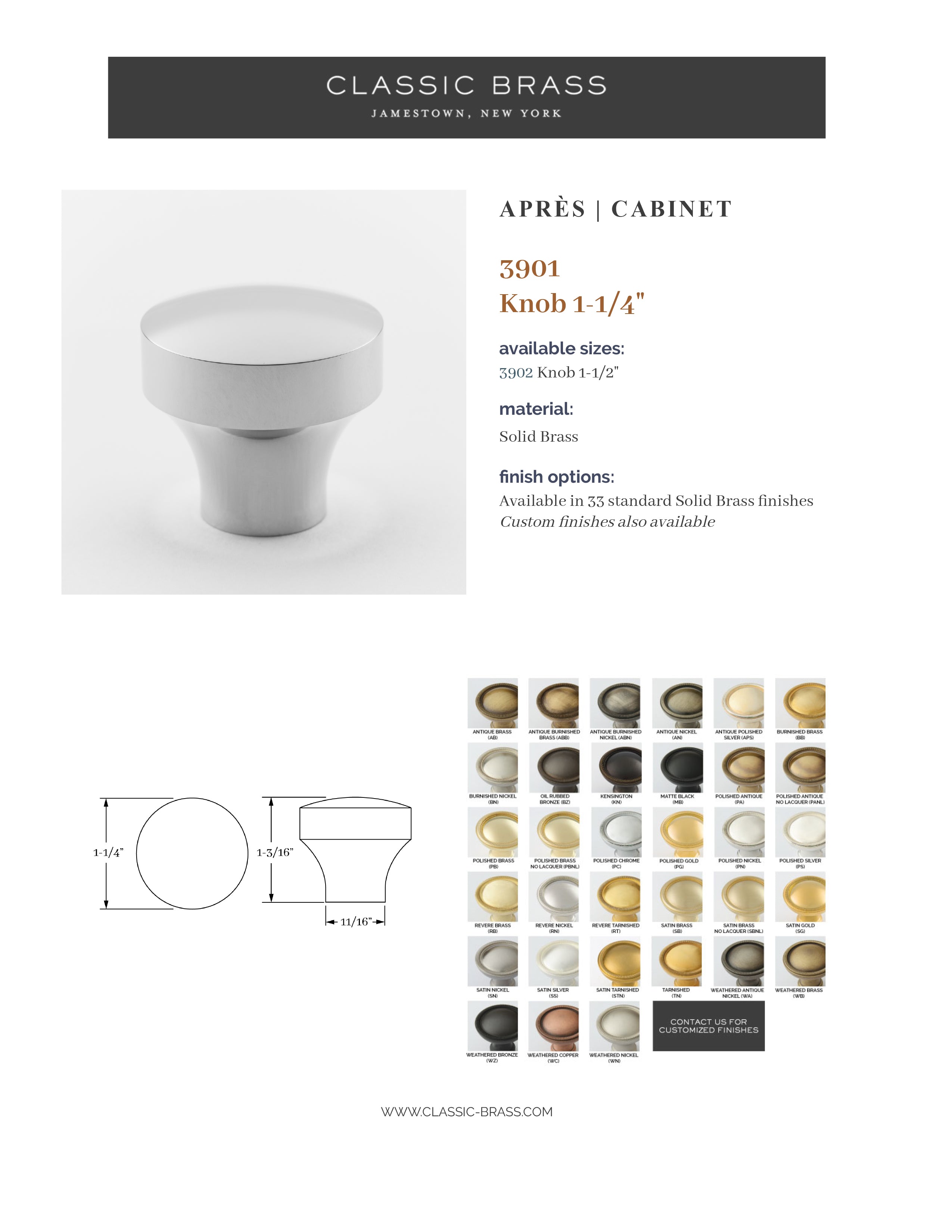 3901, Knob - 1-1/4", Classic Brass Apres Collection