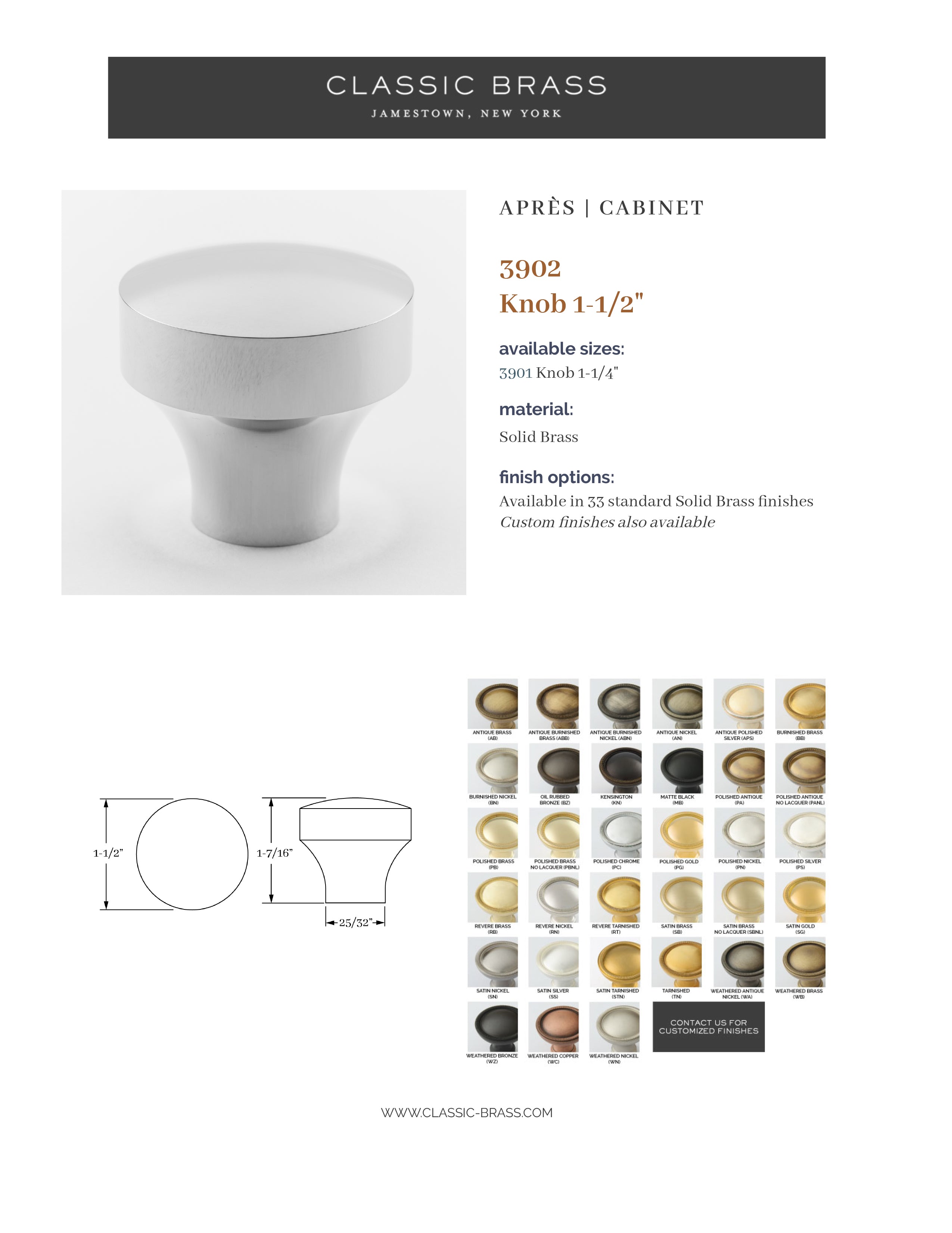 3902, Knob - 1-1/2", Classic Brass Apres Collection