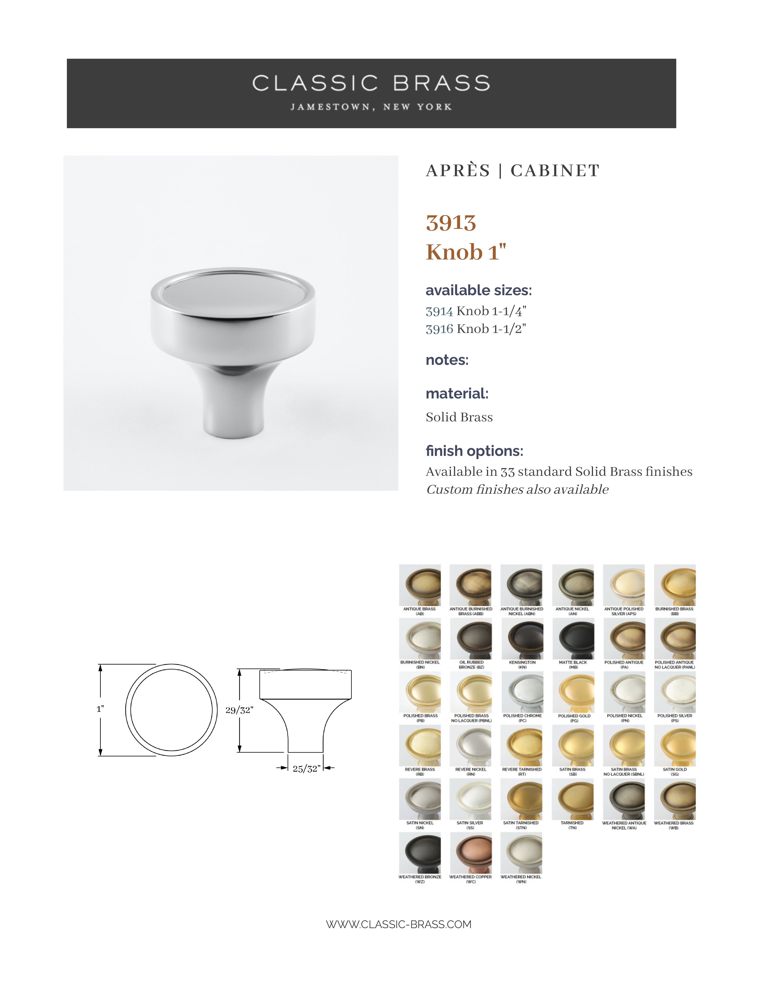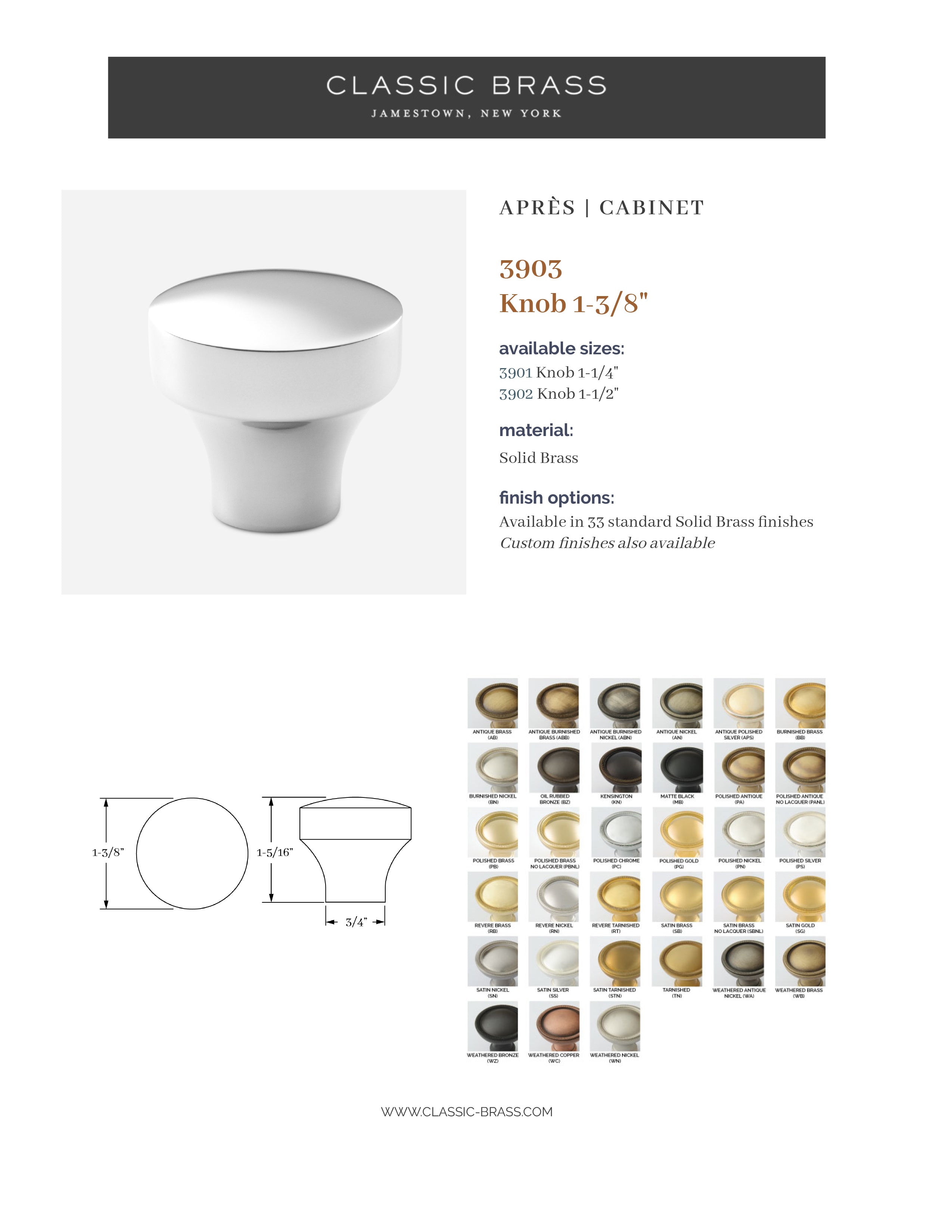 3914, Knob - 1-1/4", Classic Brass Apres Collection