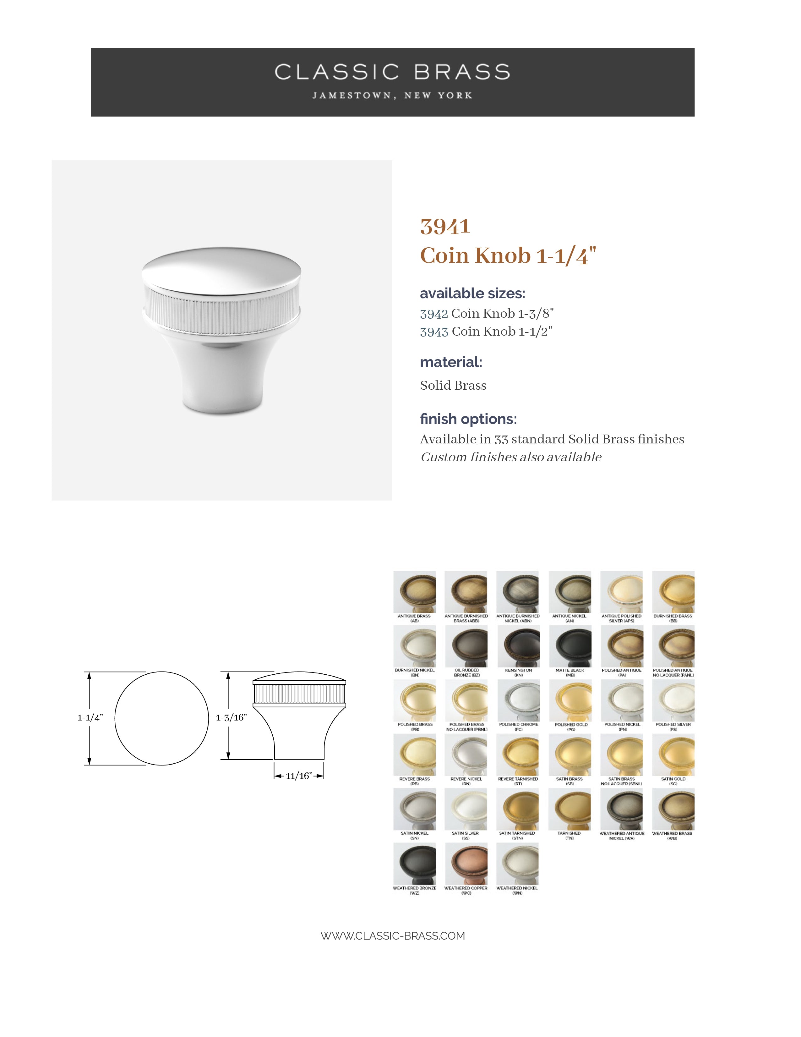 2209, Knob - Coin - 1-1/4", Classic Brass Palmer Collection