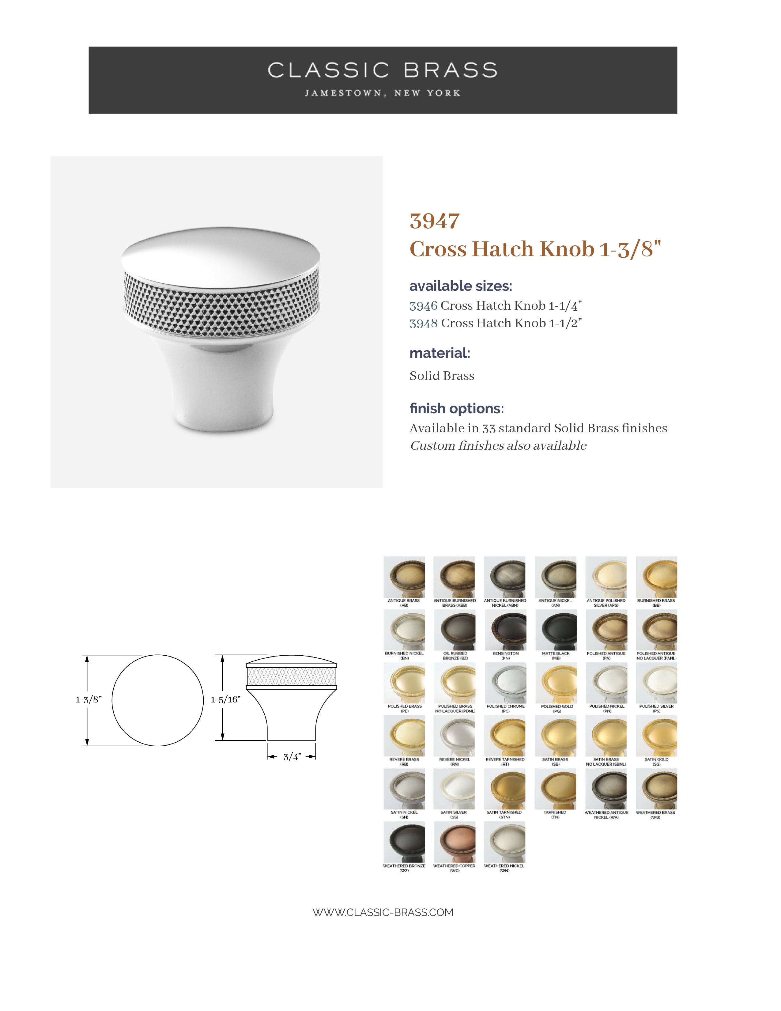 3946, Knob - 1-1/4" Cross Hatch, Classic Brass Apres Collection