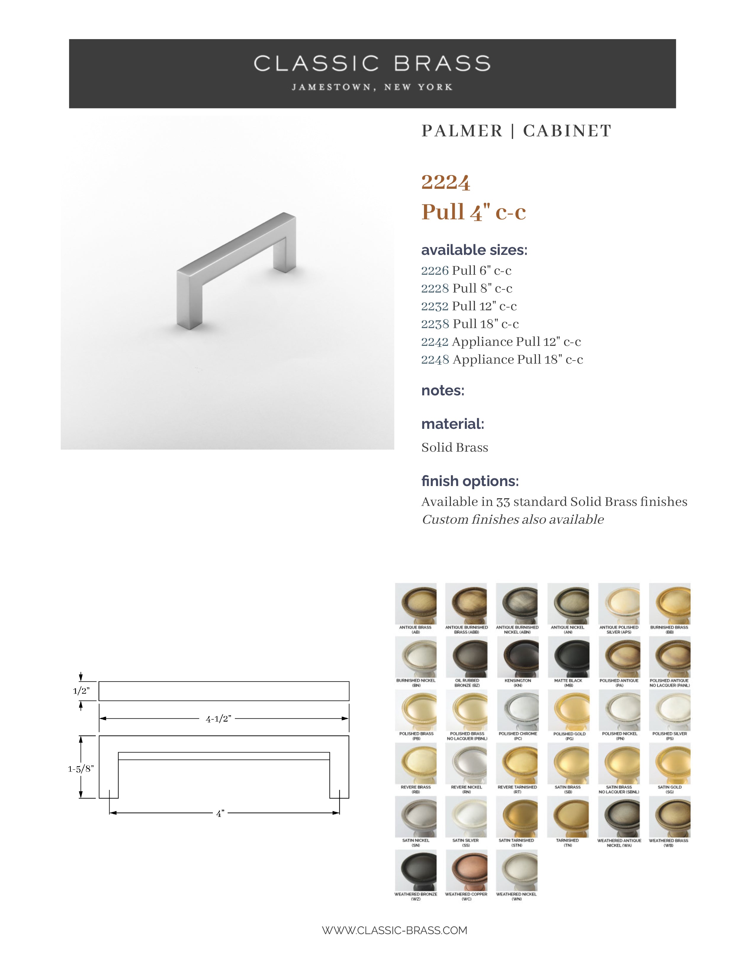 2224, Pull - 4" c-c, Classic Brass Palmer Collection