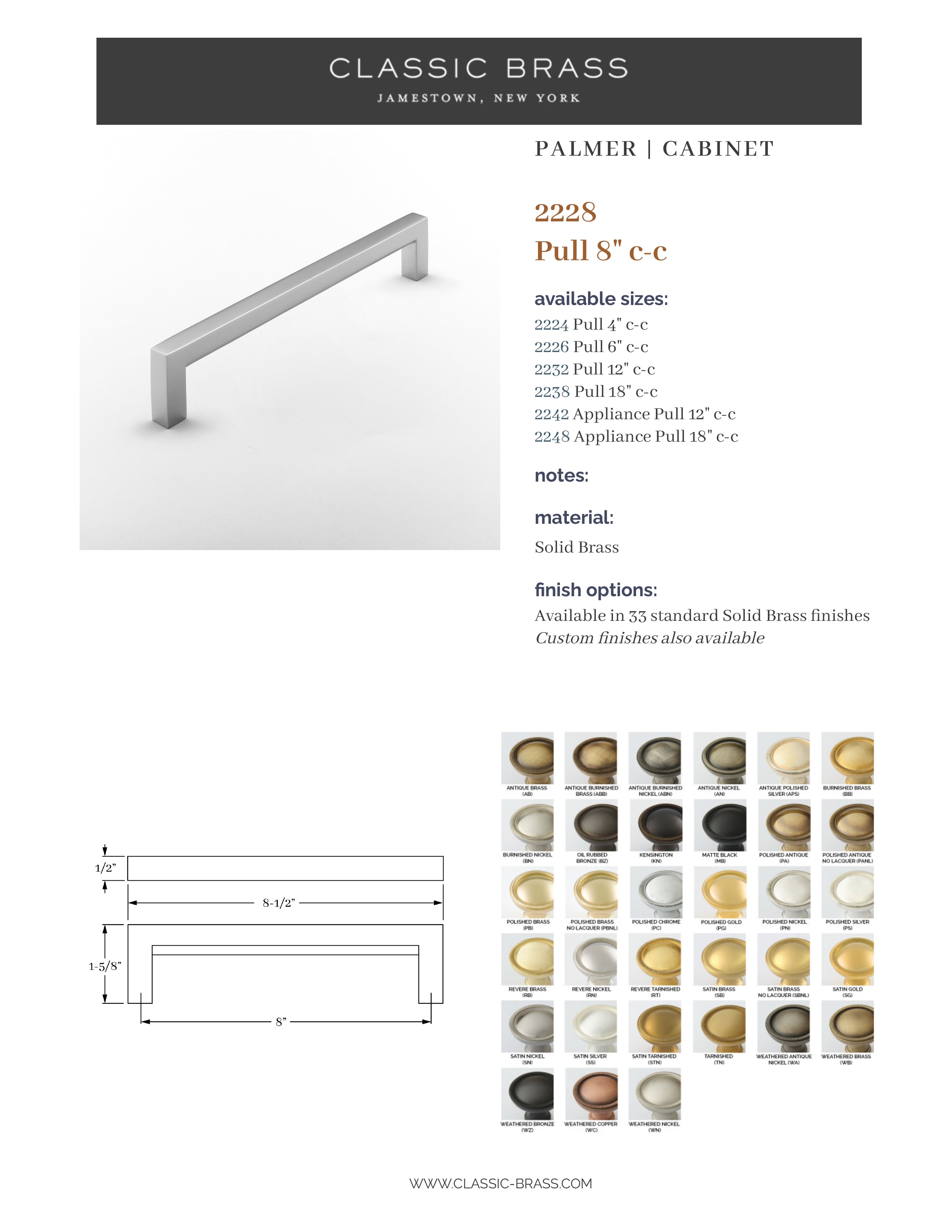 2228, Pull - 8" c-c, Classic Brass Palmer Collection
