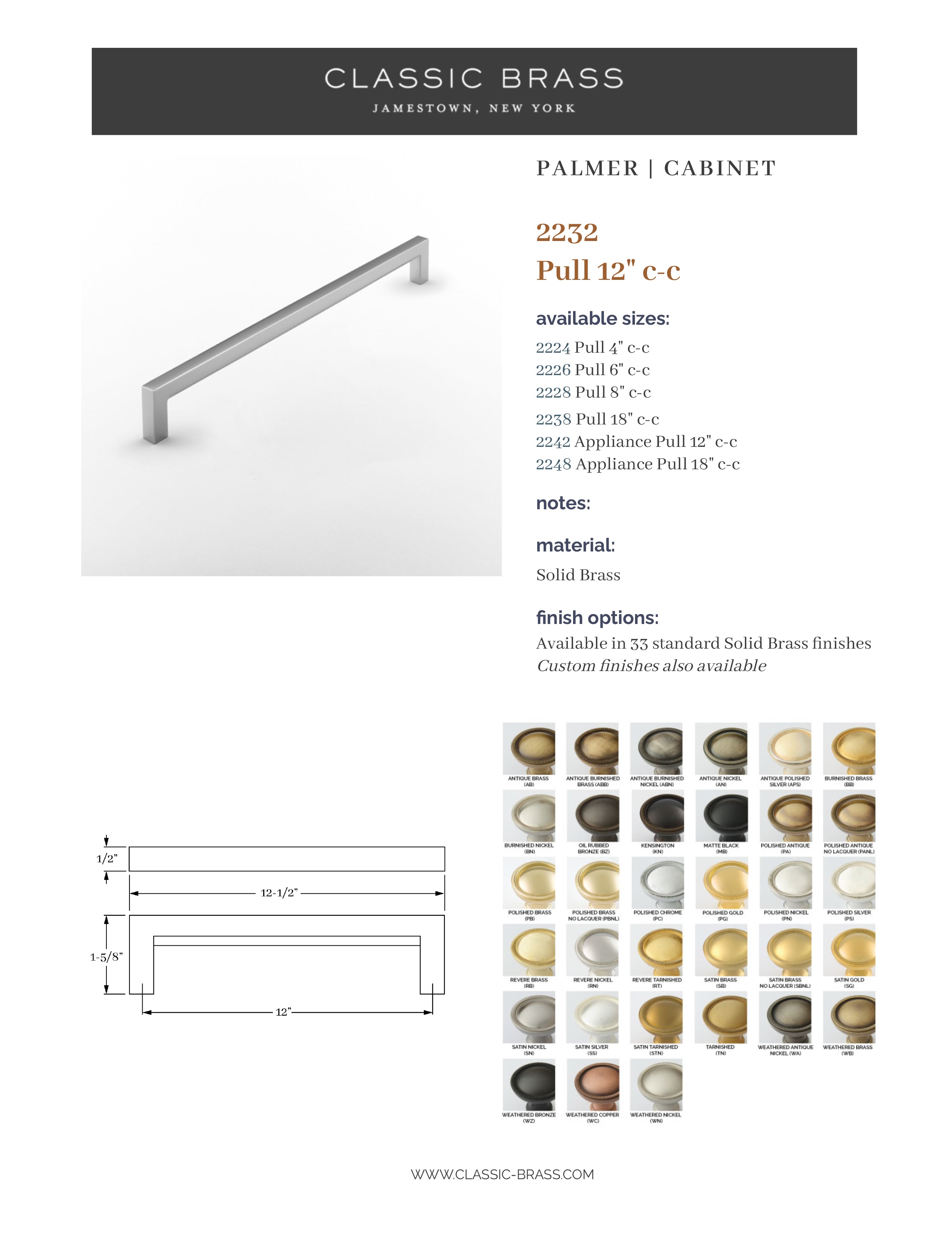 2232, Pull - 12" c-c, Classic Brass Palmer Collection