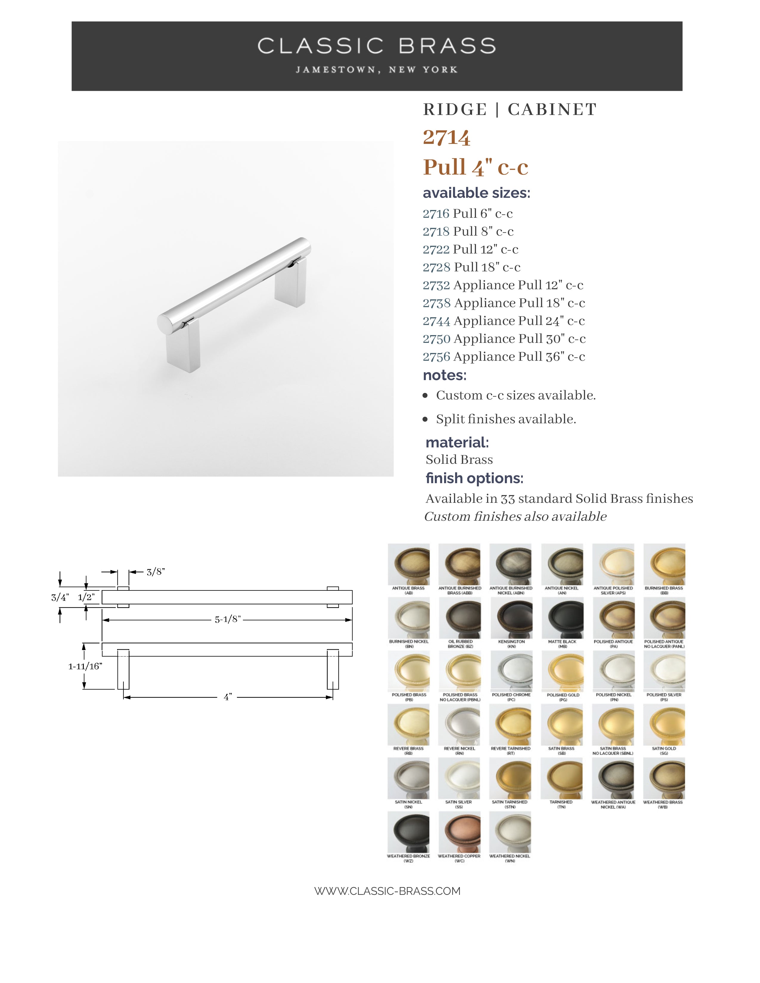 2714, Pull - 4" c-c, Classic Brass Ridge Collection