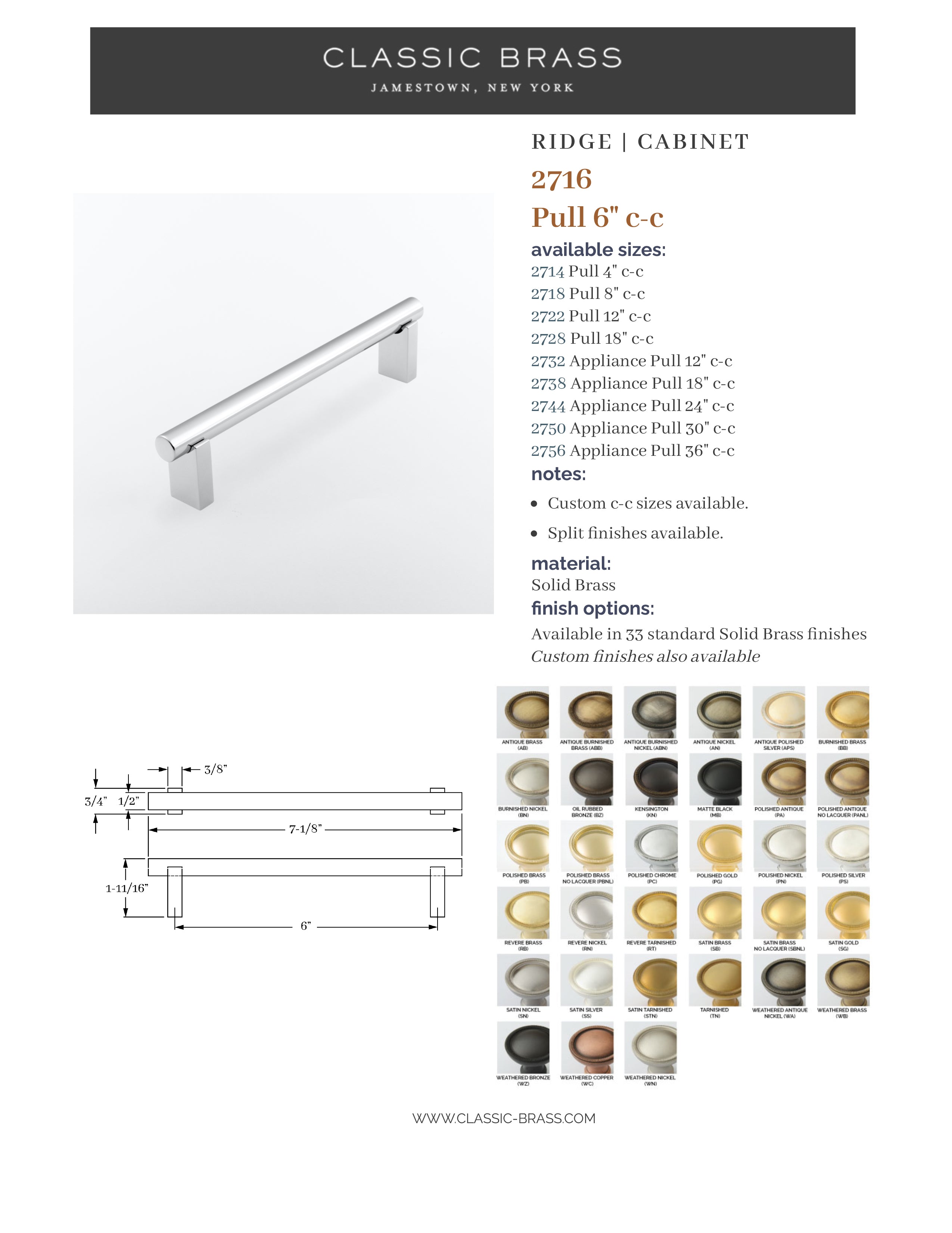 2716, Pull - 6" c-c, Classic Brass Ridge Collection