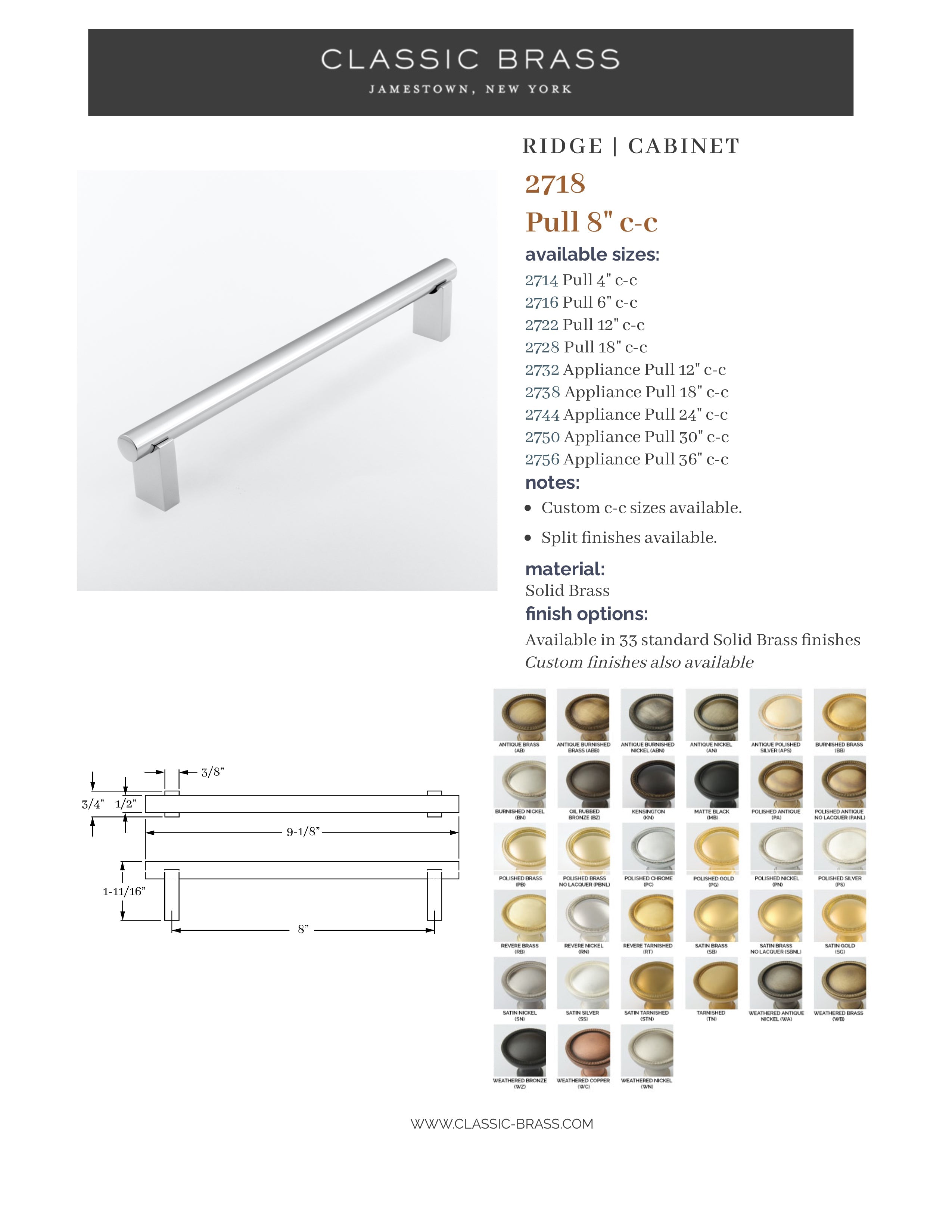 2718, Pull - 8" c-c, Classic Brass Ridge Collection