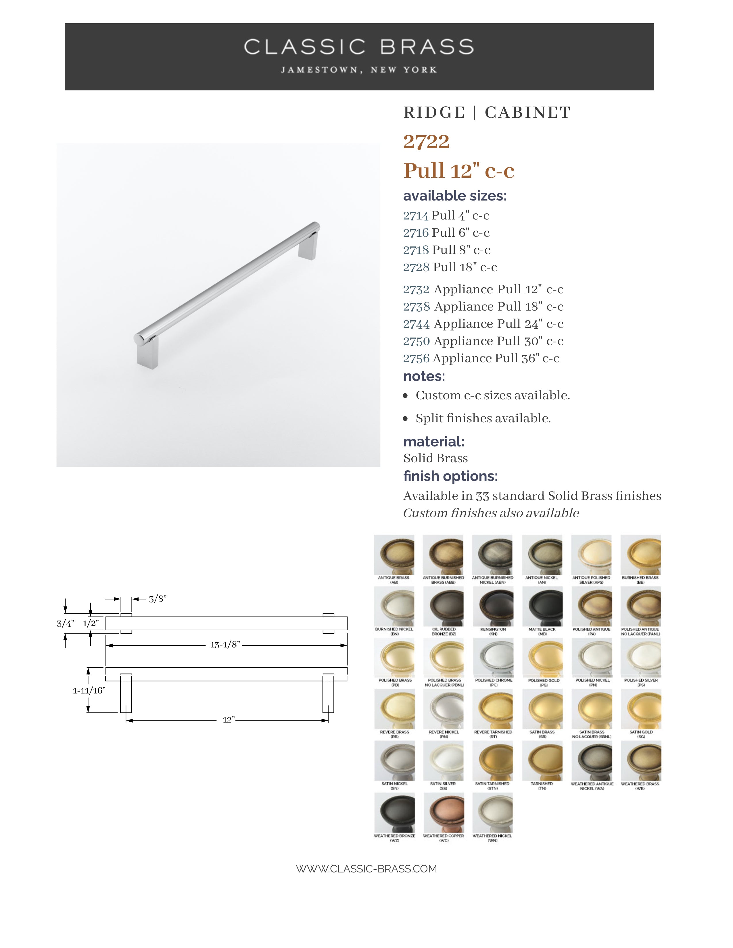 2722, Pull - 12" c-c, Classic Brass Ridge Collection