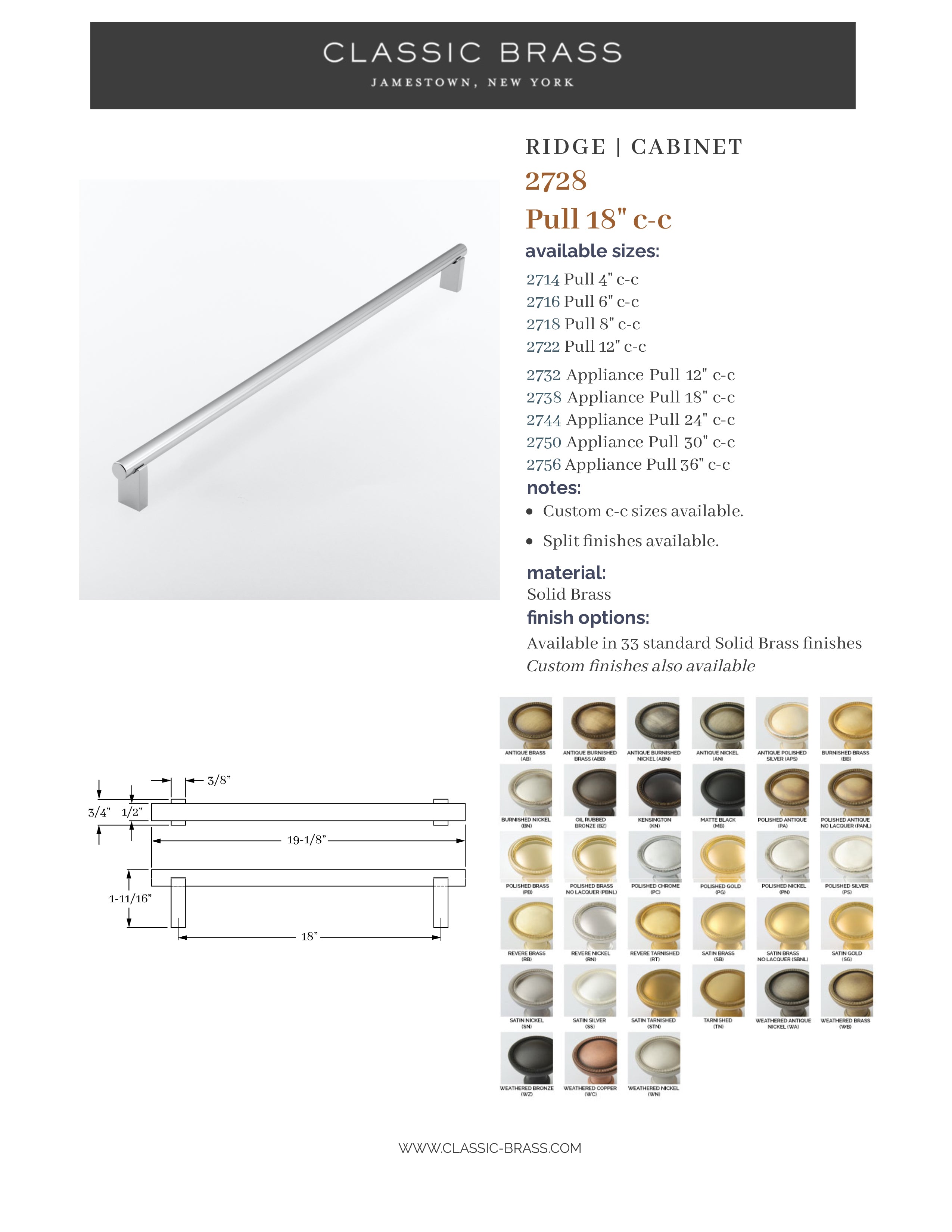 2728, Pull - 18" c-c, Classic Brass Ridge Collection