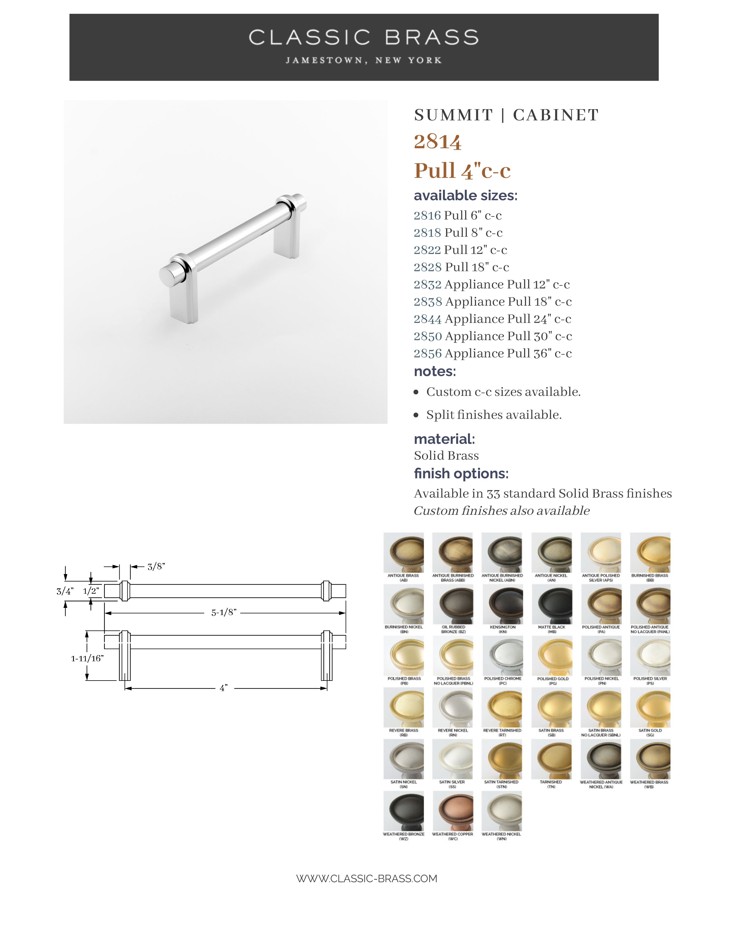 2814, Pull - 4" c-c, Classic Brass Summit Collection