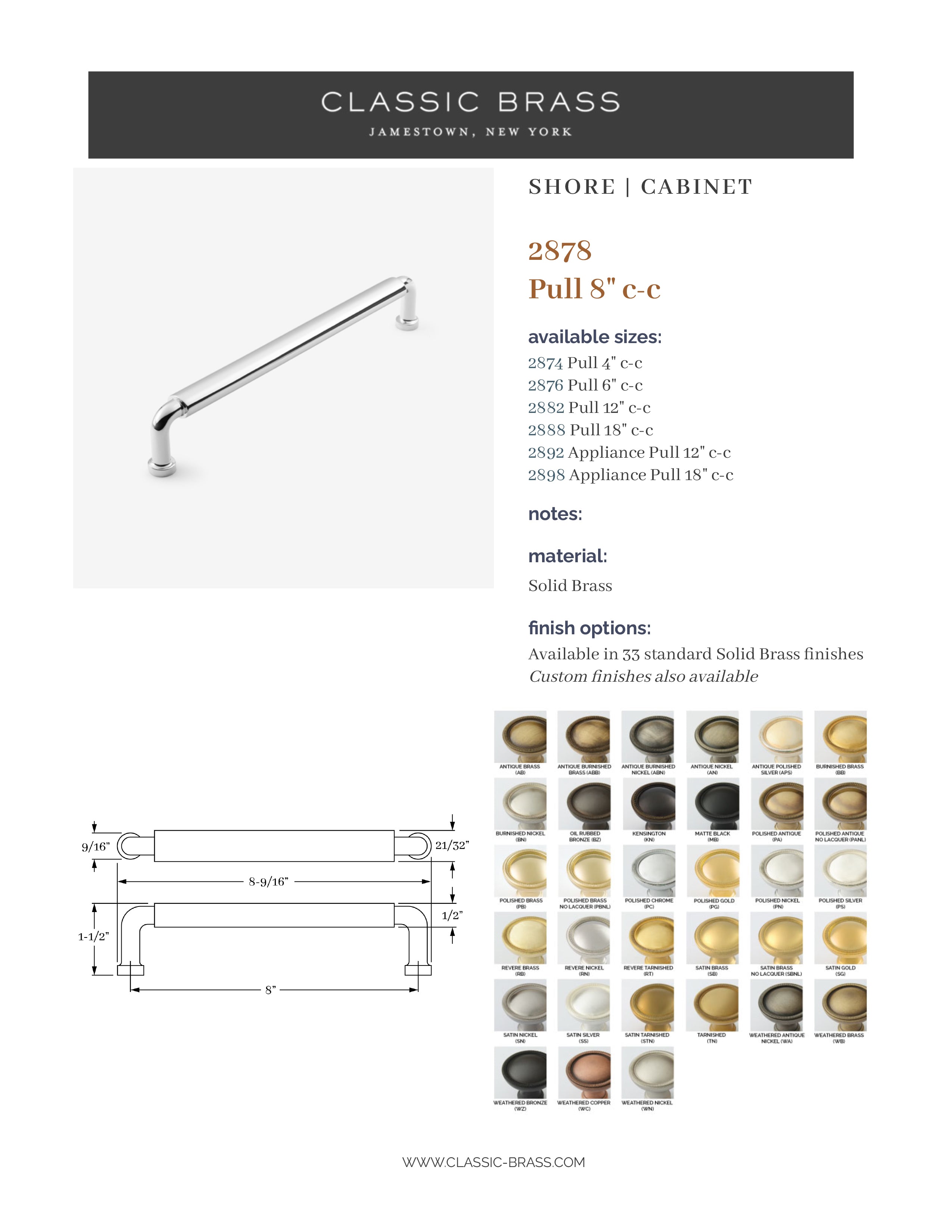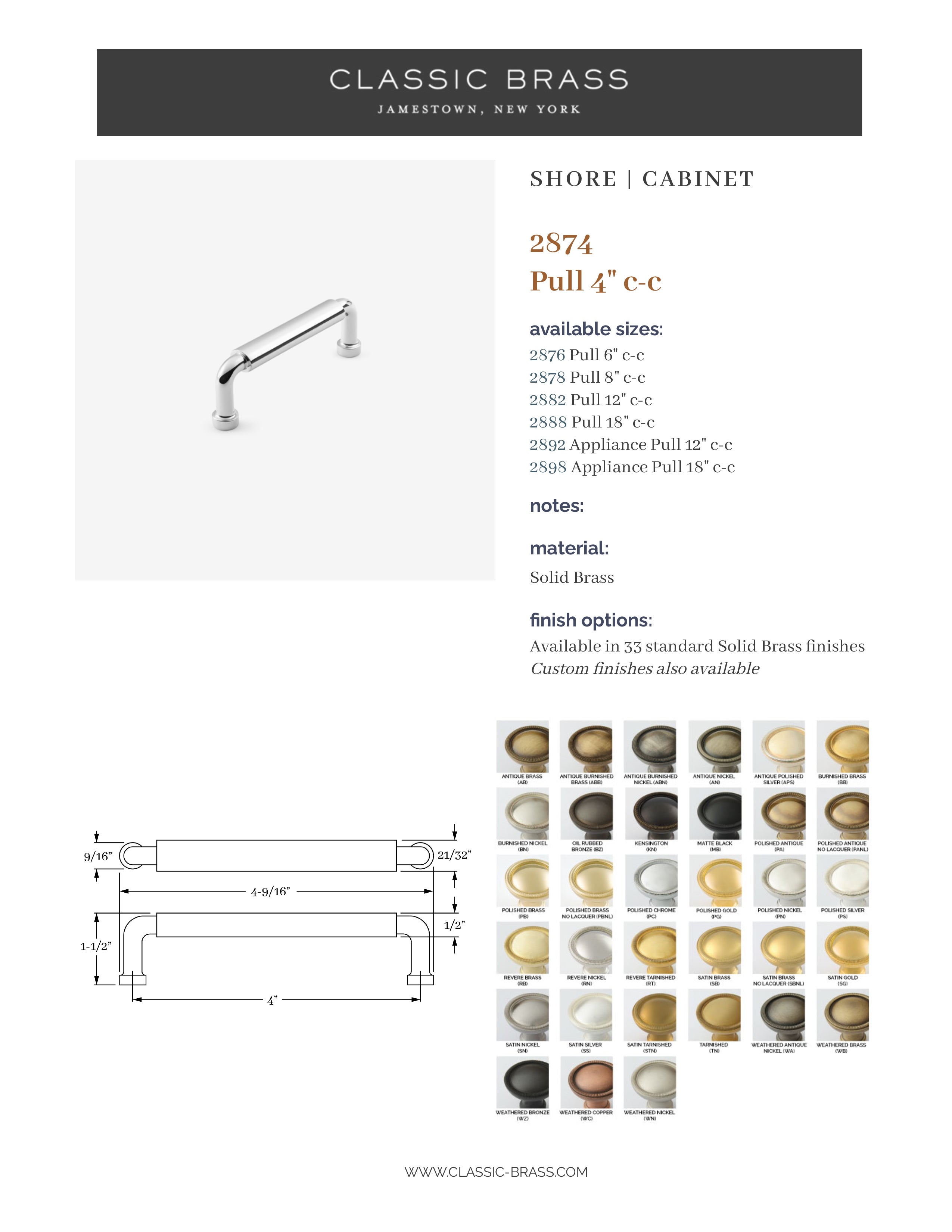 2874, Oval Pull - 4" c-c, Classic Brass Shore Collection