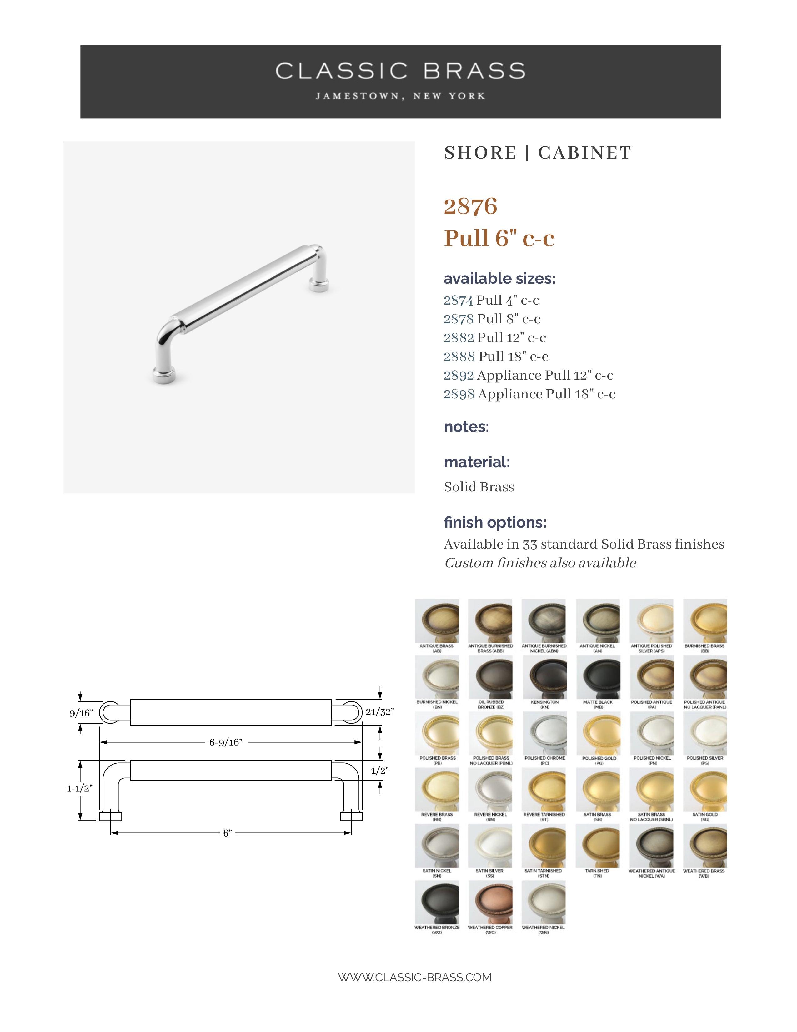2876, Oval Pull - 6" c-c, Classic Brass Shore Collection