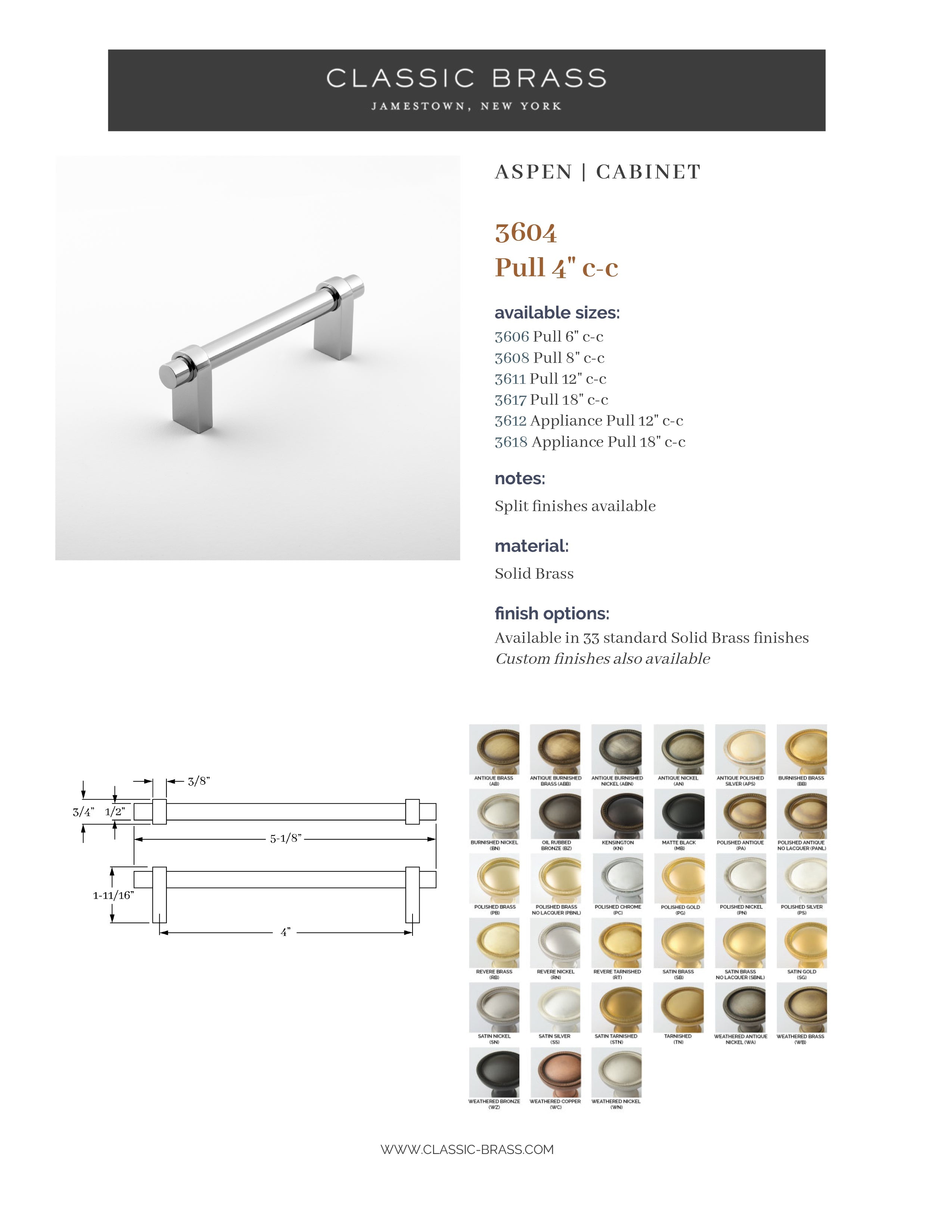3604, Pull - 4"c-c, Classic Brass Aspen Collection