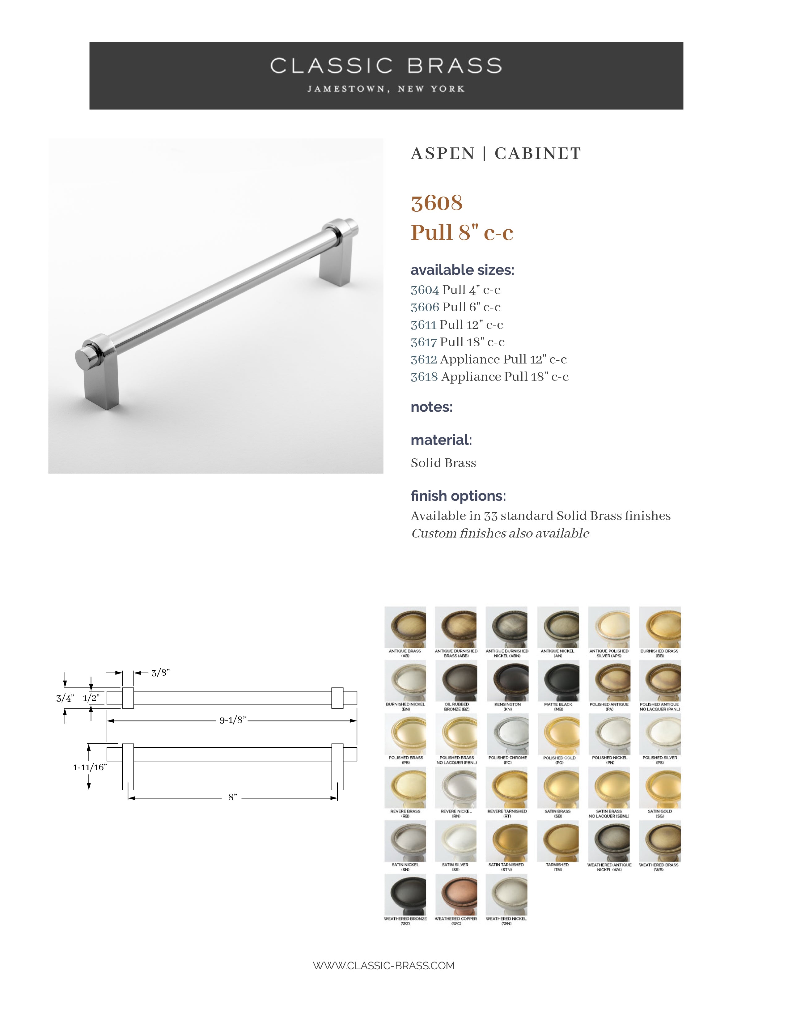 3608, Pull - 8" c-c, Classic Brass Aspen Collection