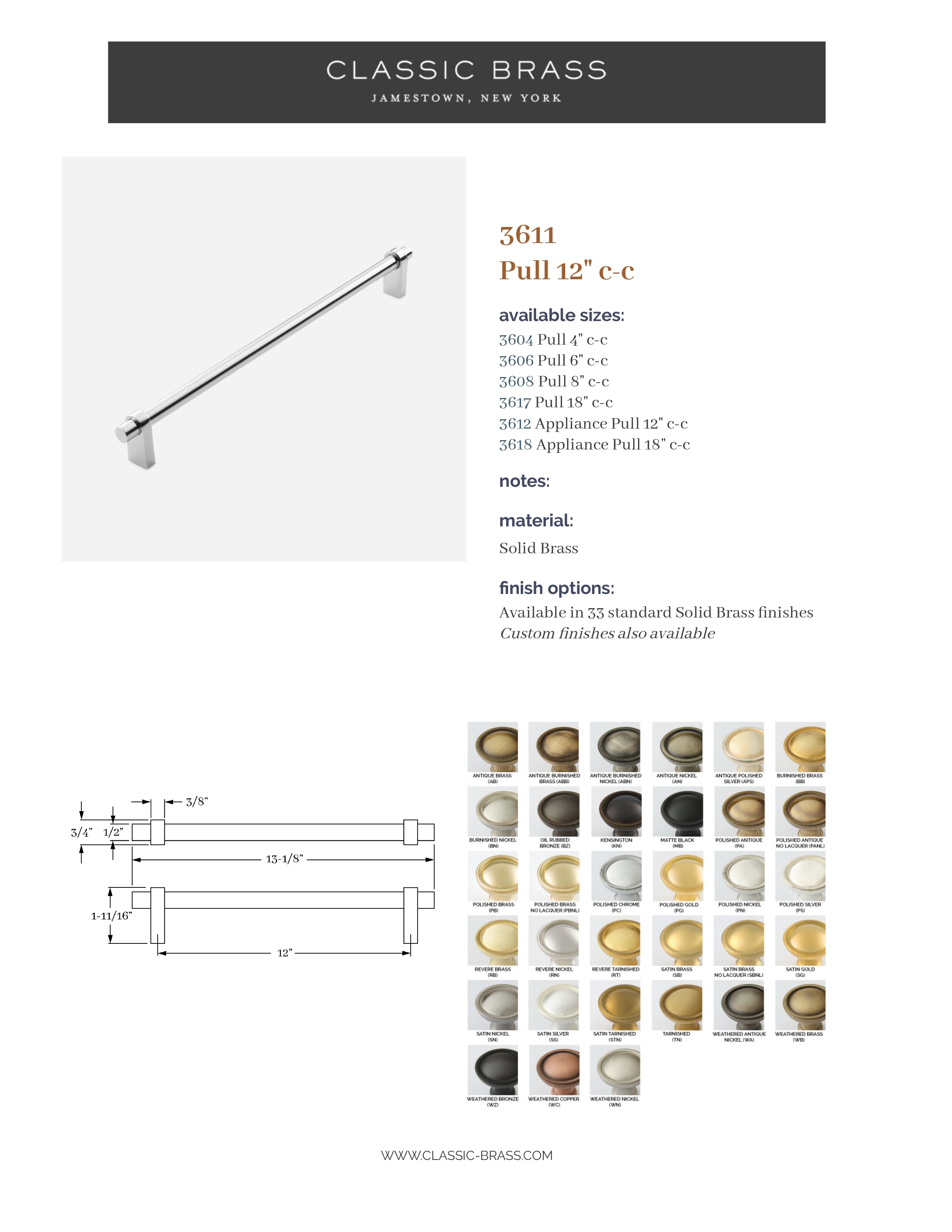 3611, Pull -12" c-c, Classic Brass Aspen Collection