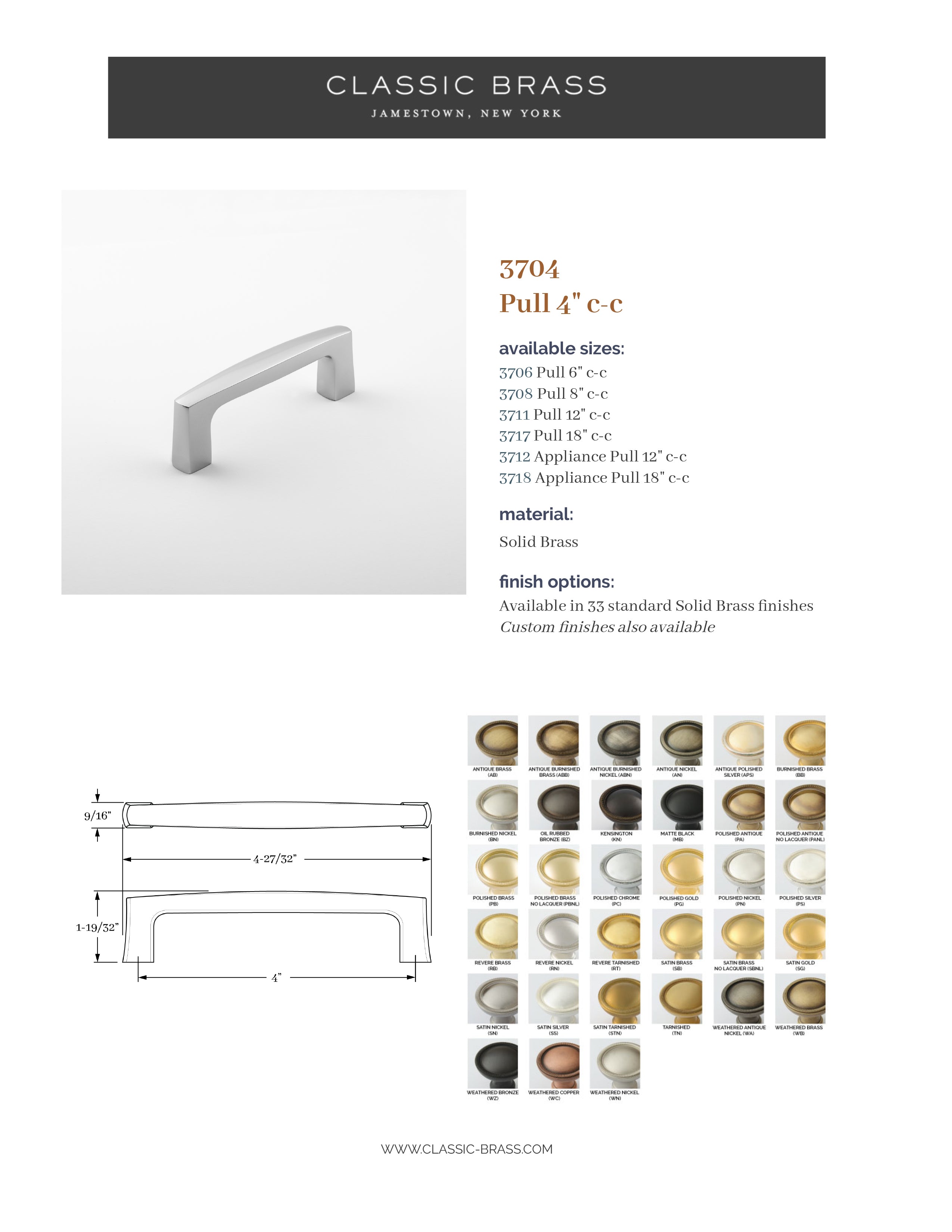 3704, Pull - 4" c-c, Classic Brass Park Lane Collection