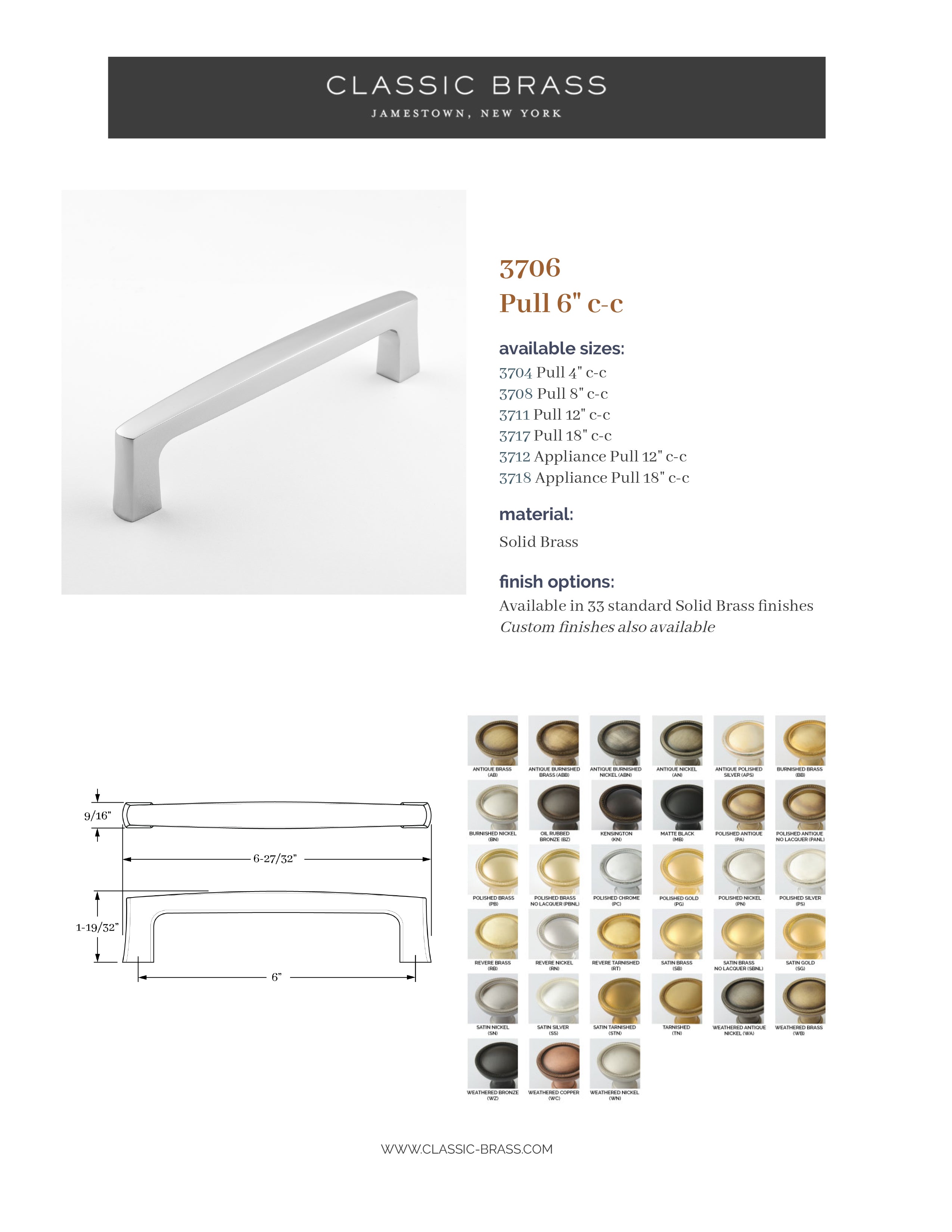 3706, Pull - 6" c-c, Classic Brass Park Lane Collection
