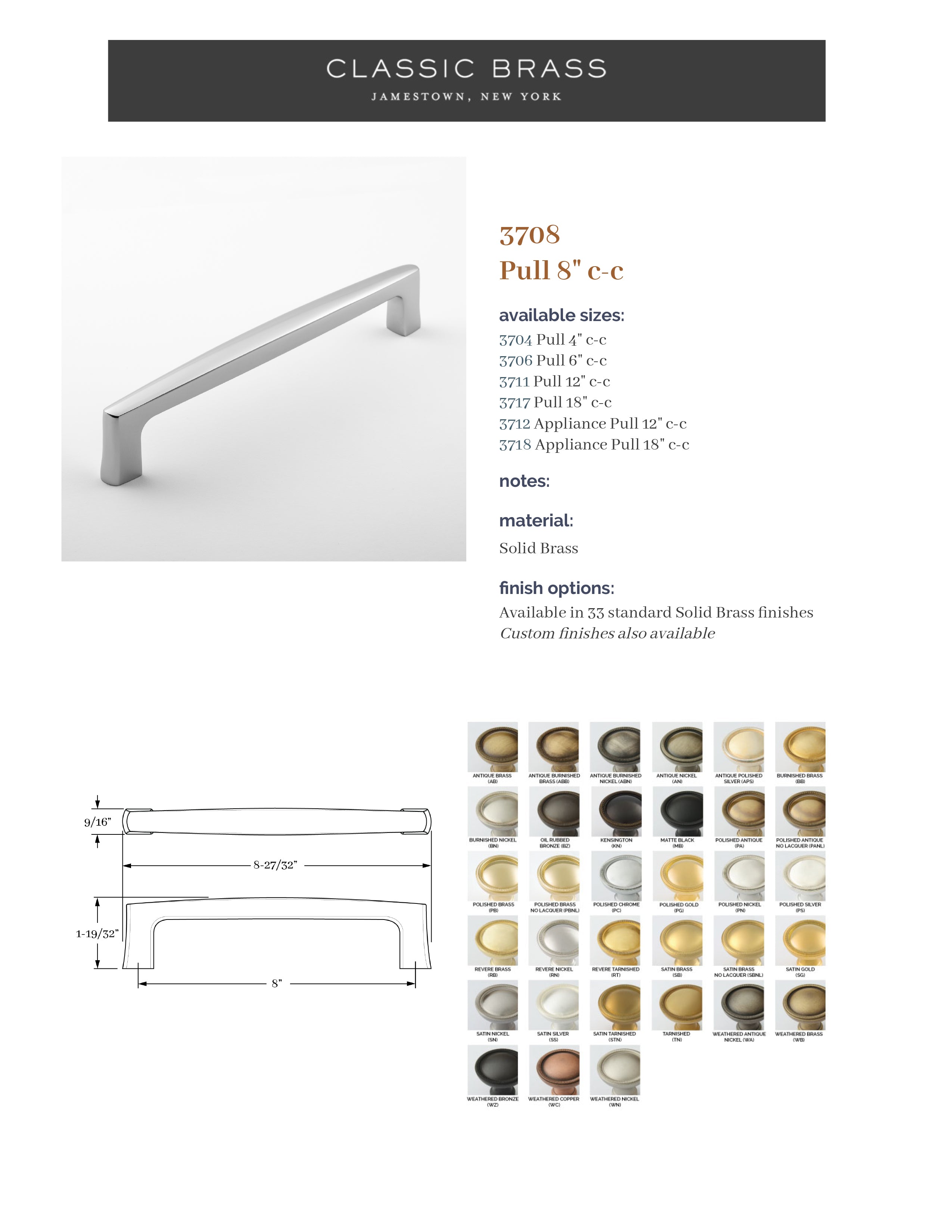3708, Pull - 8" c-c, Classic Brass Park Lane Collection