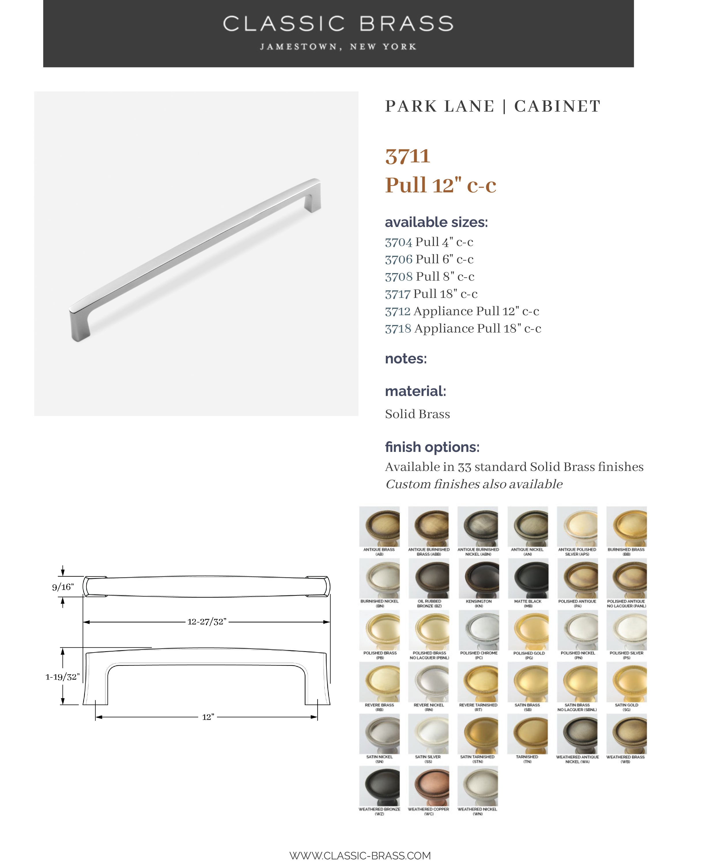 3711, Pull - 12" c-c, Classic Brass Park Lane Collection
