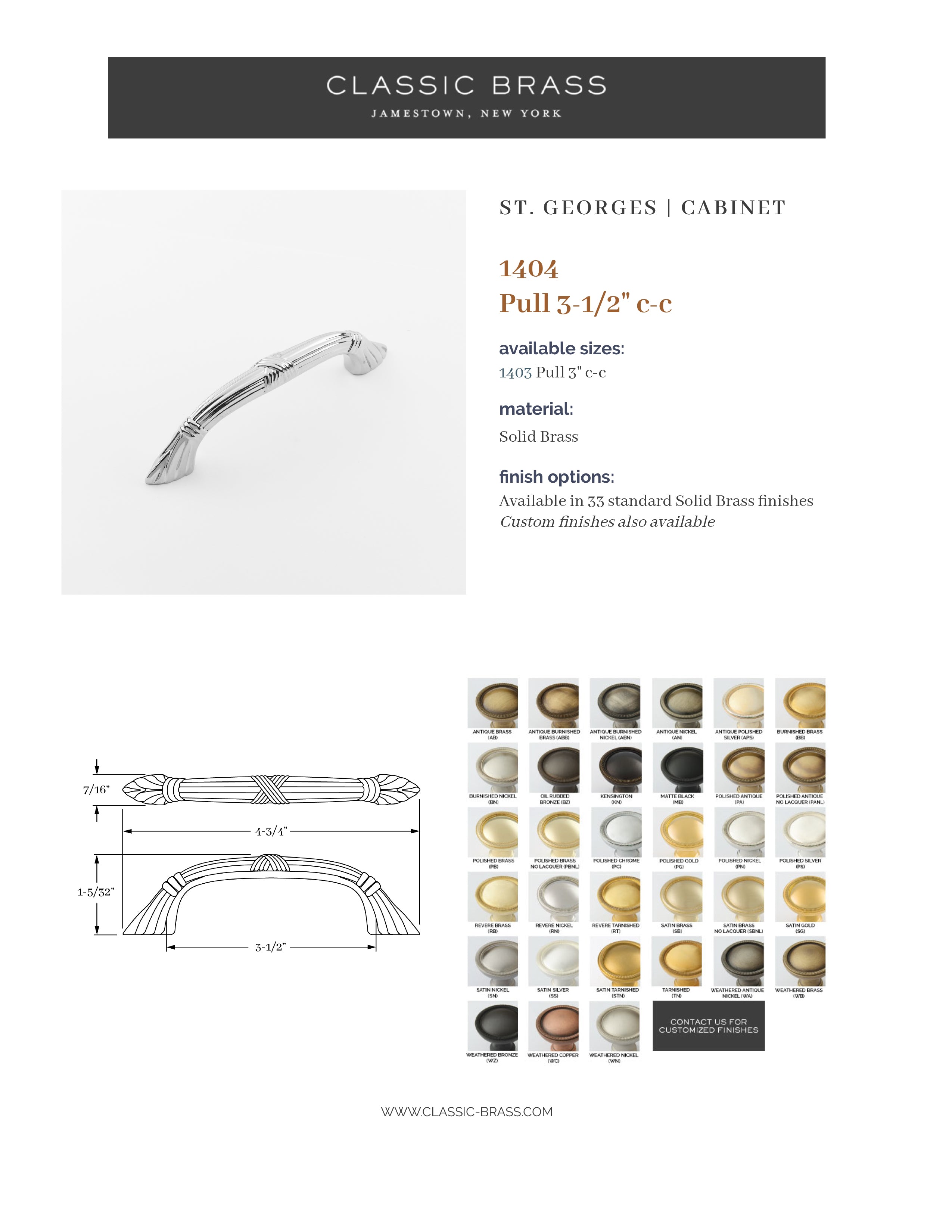 1404, Pull - 3-1/2" c-c, Classic Brass St. Georges Collection