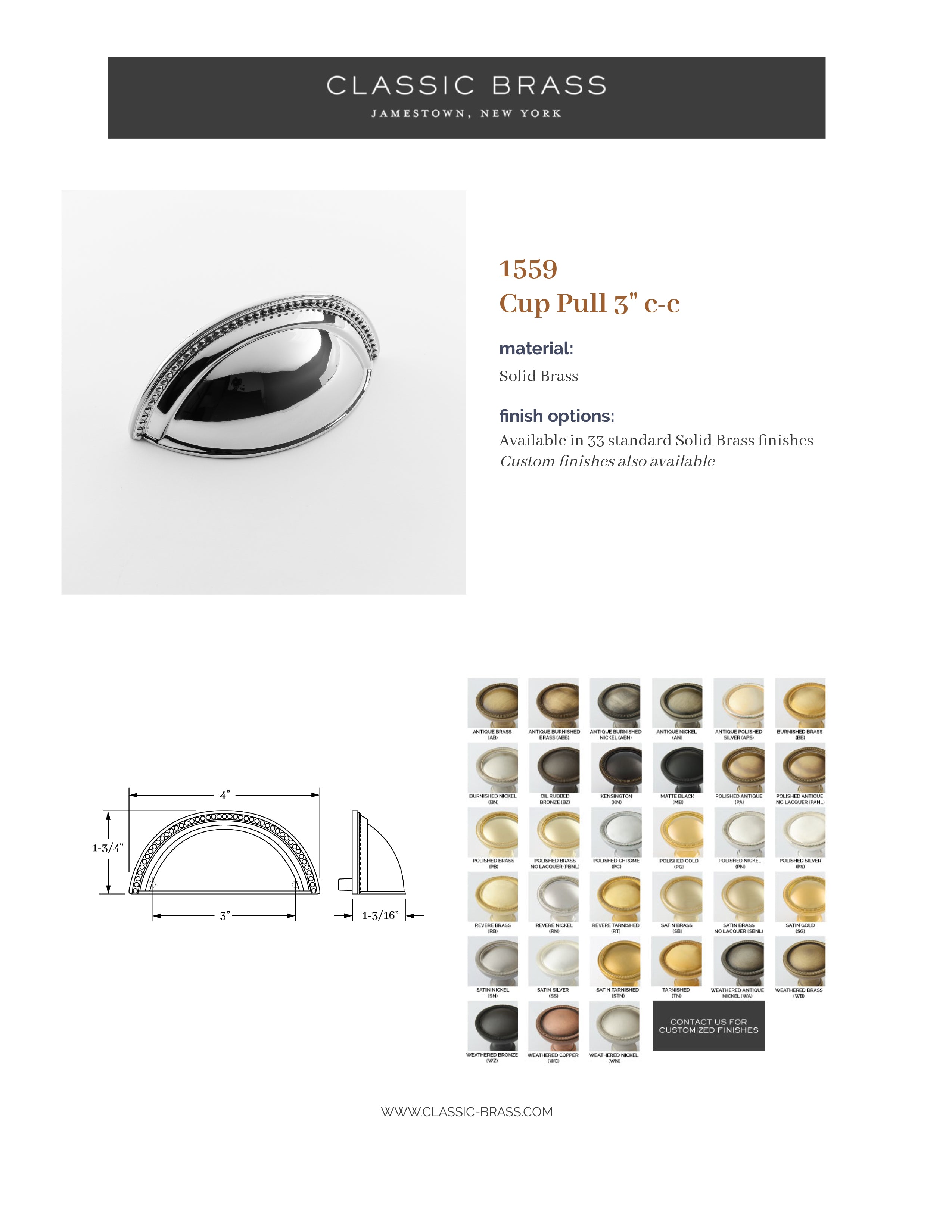 1450, Cup Pull - 3" c-c, Classic Brass St. Georges Collection