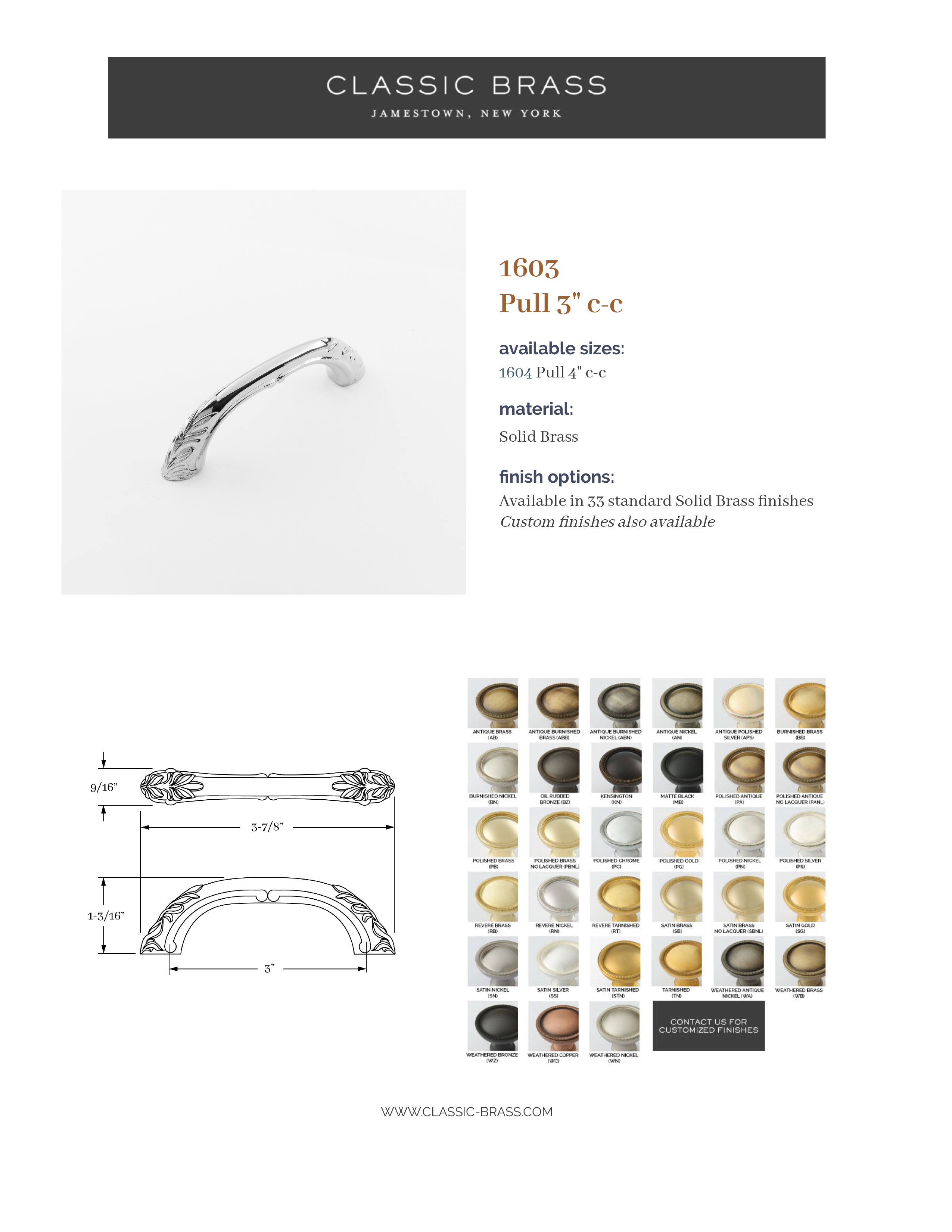 1603, Pull - 3" c-c, Classic Brass Hyde Park Collection