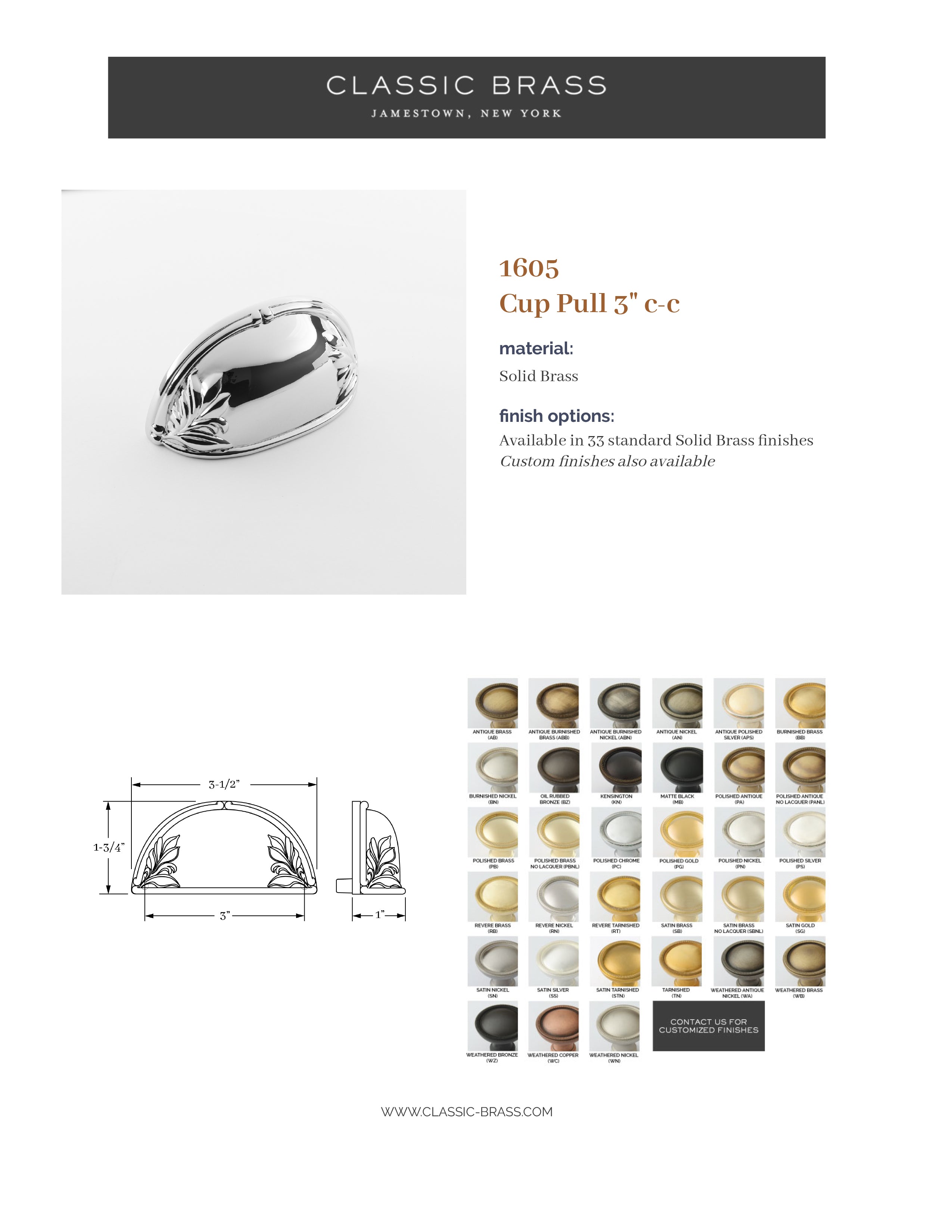 1605, Cup Pull - 3" c-c, Classic Brass Hyde Park Collection