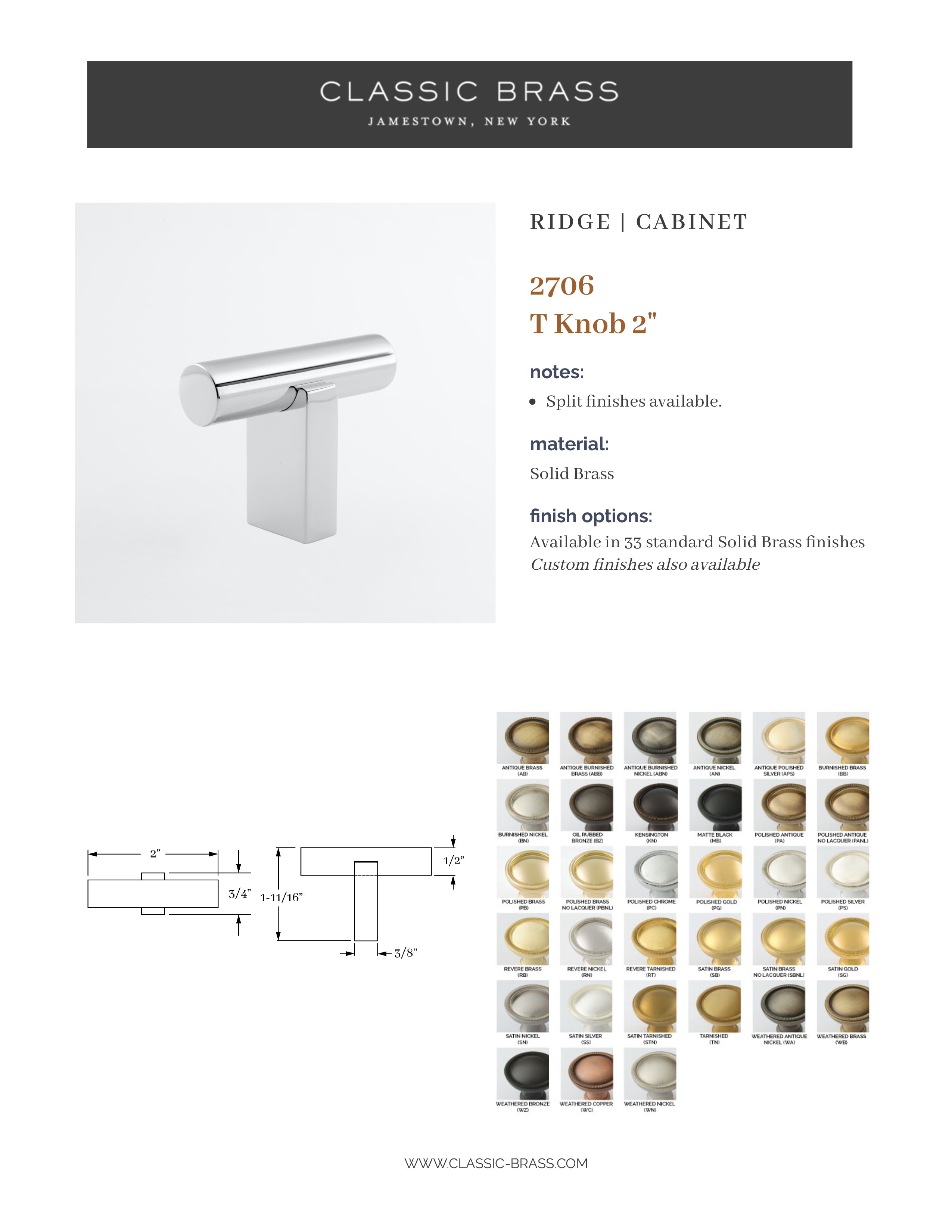2706, T- Knob - 2", Classic Brass Ridge Collection