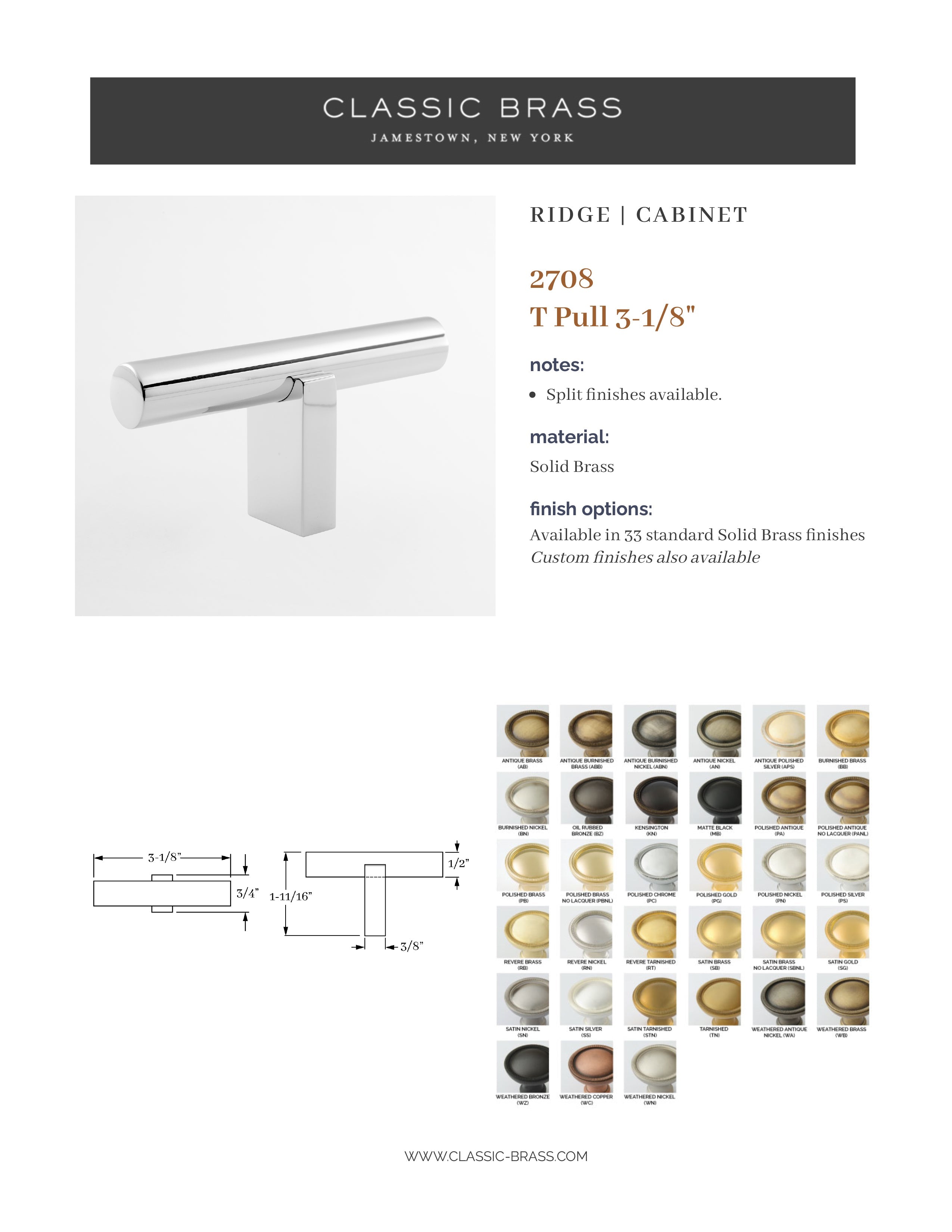 2708, T-Pull - 3-1/8", Classic Brass Ridge Collection