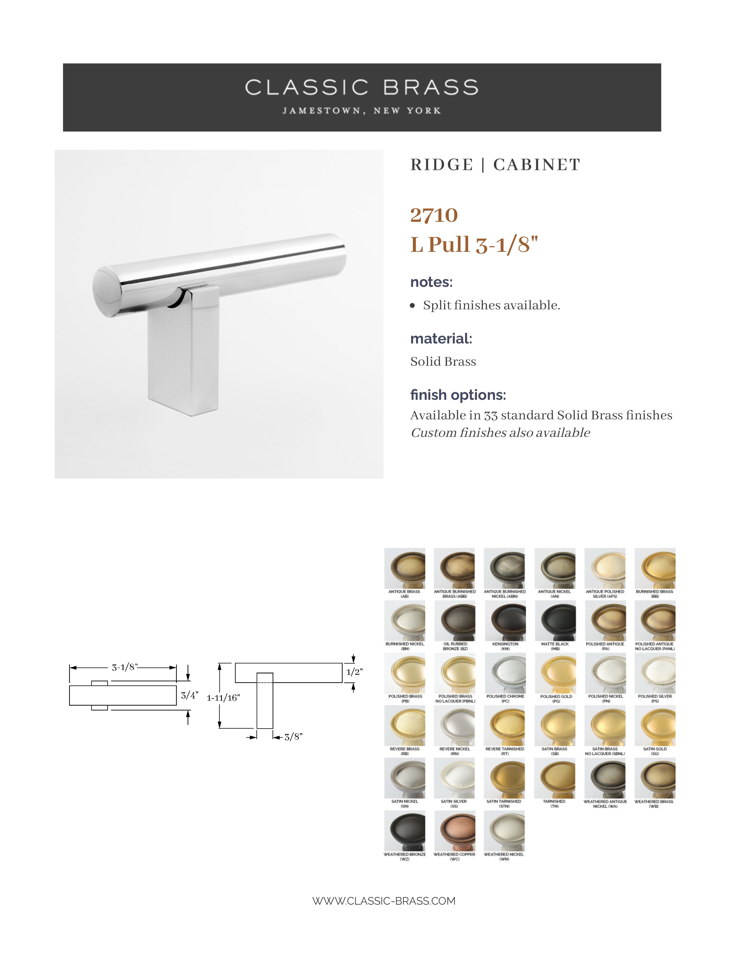 2710, L-Pull - 3-1/8", Classic Brass Ridge Collection