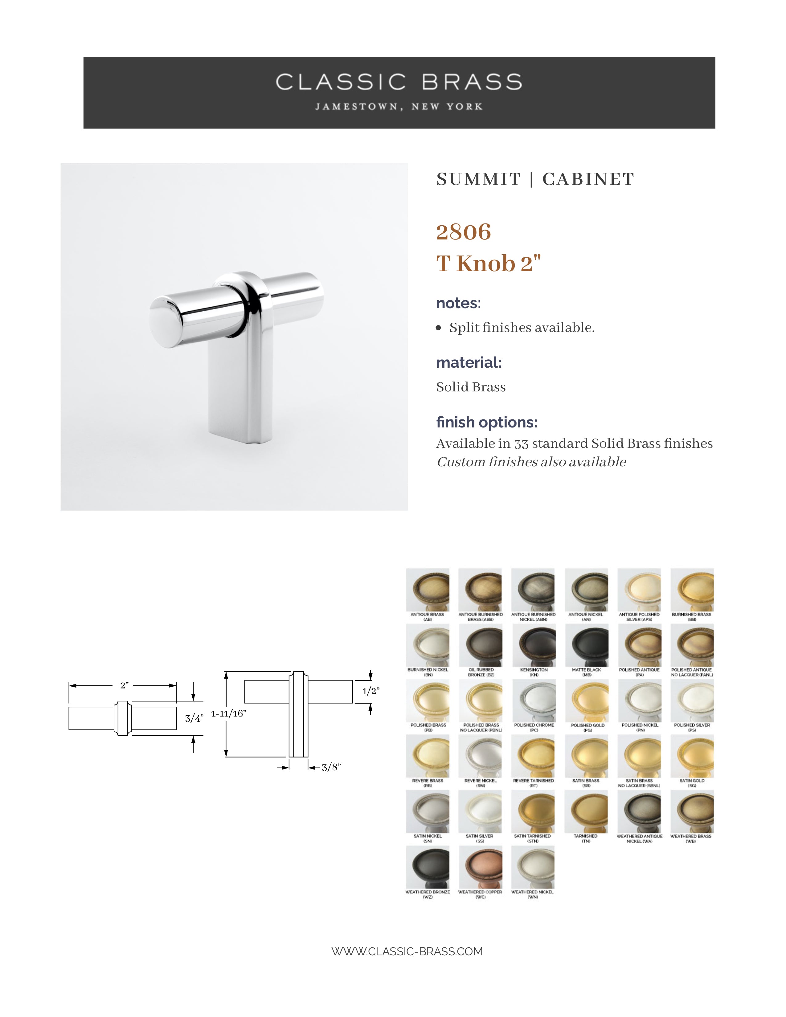 2806, T- Knob - 2", Classic Brass Summit Collection