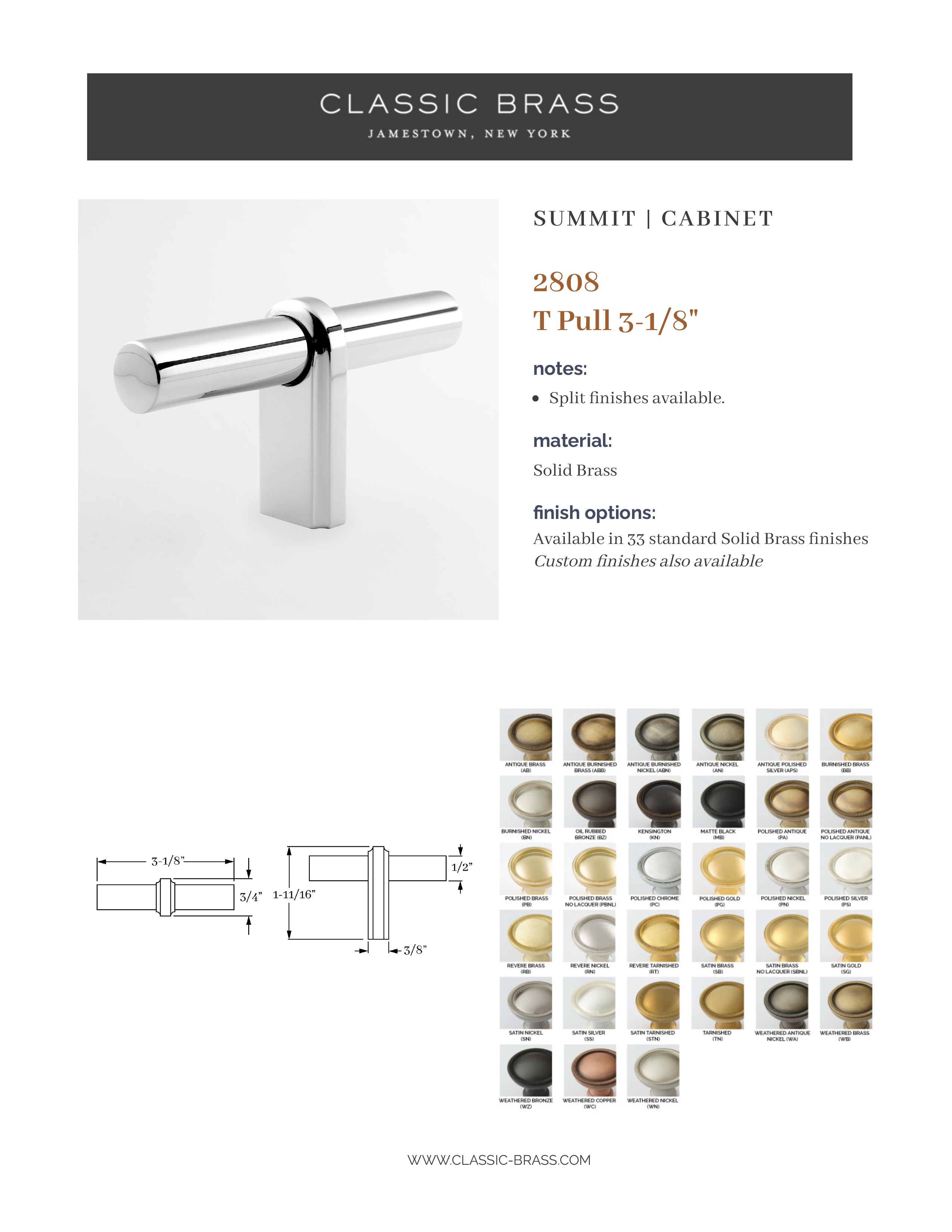 2808, T-Pull - 3-1/8", Classic Brass Summit Collection